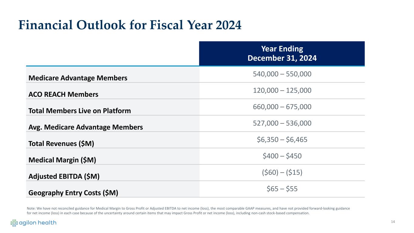 13 $132 $142 $201 $123 $143 $98 $35 $86 $91 $121 $62 $146 $107 $132 $128 $50 $101 $80 $61 $89 $21 2018 2019 2020 2021 2022 2023 Class 2018 Class 2019 Class 2020 Class 2021 Class 2022 Class 2023 Elevated Medical Cost Environment Relative to Revenue Benchmarks Note 1: Reflects incurred results; Note 2: 2020 reflects COVID-19 impact; Note 3: Reflects full allocation of costs to member-level cohorts, including Part D and other (other risk pool, certain health plans with limited data) Medical Margin PMPM by Market Class Copyright © 2023 agilon health Market Class Progression (Reported Results) 2018: 12% 2019: 24% 2020: 15% 2021: 11% 2022: 14% Membership CAGR by Market Class (Go-Live to 2023) 2018 Market Class includes one large market with significant growth and physician performance variability. Deploying enhanced PCP onboarding and education during 2H24. 2019 Market Class includes one high performing market and one large, low performing market. Low performing market has experienced significant growth and PCP performance variability. Deploying enhanced PCP training during 2H24.