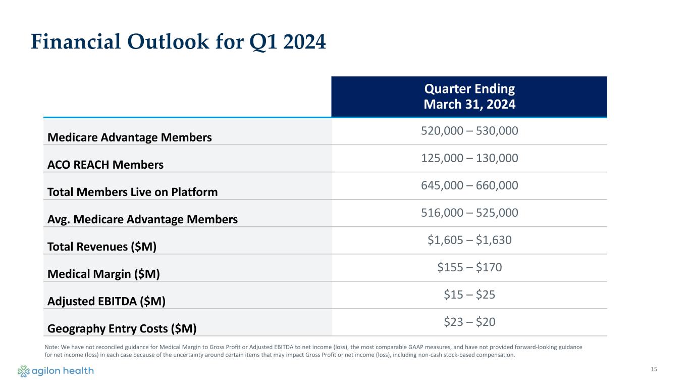 14 Year Ending December 31, 2024 Medicare Advantage Members 540,000 – 550,000 ACO REACH Members 120,000 – 125,000 Total Members Live on Platform 660,000 – 675,000 Avg. Medicare Advantage Members 527,000 – 536,000 Total Revenues ($M) $6,350 – $6,465 Medical Margin ($M) $400 – $450 Adjusted EBITDA ($M) ($60) – ($15) Geography Entry Costs ($M) $65 – $55 Financial Outlook for Fiscal Year 2024 Note: We have not reconciled guidance for Medical Margin to Gross Profit or Adjusted EBITDA to net income (loss), the most comparable GAAP measures, and have not provided forward-looking guidance for net income (loss) in each case because of the uncertainty around certain items that may impact Gross Profit or net income (loss), including non-cash stock-based compensation.