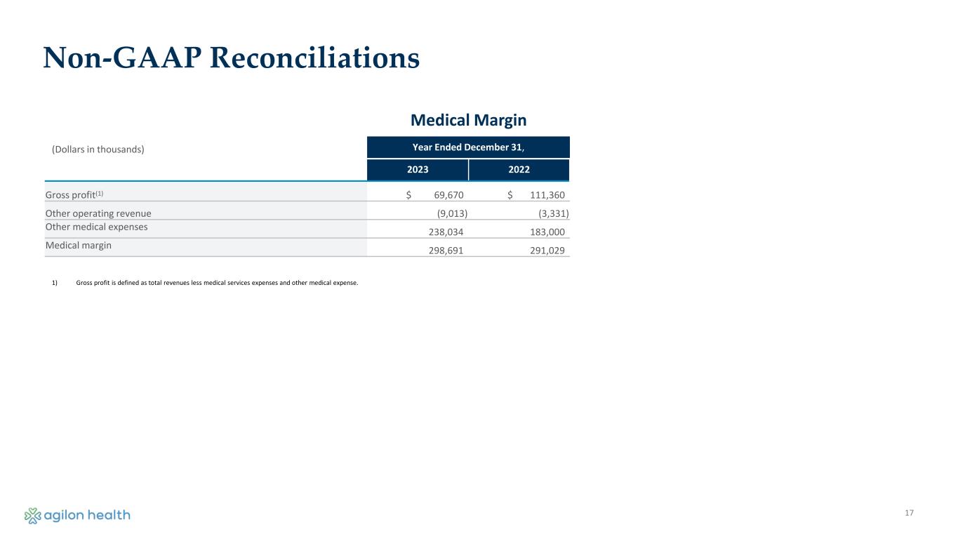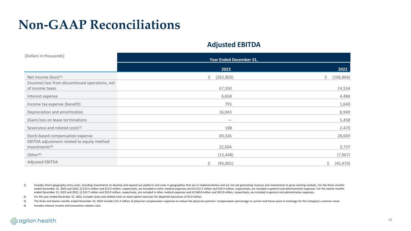 17 Non-GAAP Reconciliations (Dollars in thousands) Year Ended December 31, 2023 2022 Gross profit(1) $ 69,670 $ 111,360 Other operating revenue (9,013) (3,331) Other medical expenses 238,034 183,000 Medical margin 298,691 291,029 1) Gross profit is defined as total revenues less medical services expenses and other medical expense. Medical Margin