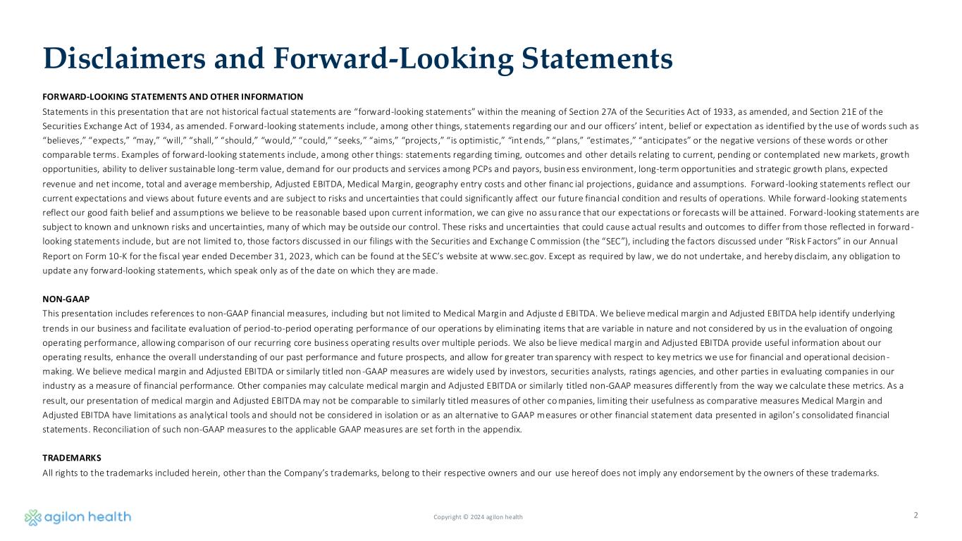 November 7, 2024 Third Quarter 2024 Earnings Results Copyright © 2024 agilon health