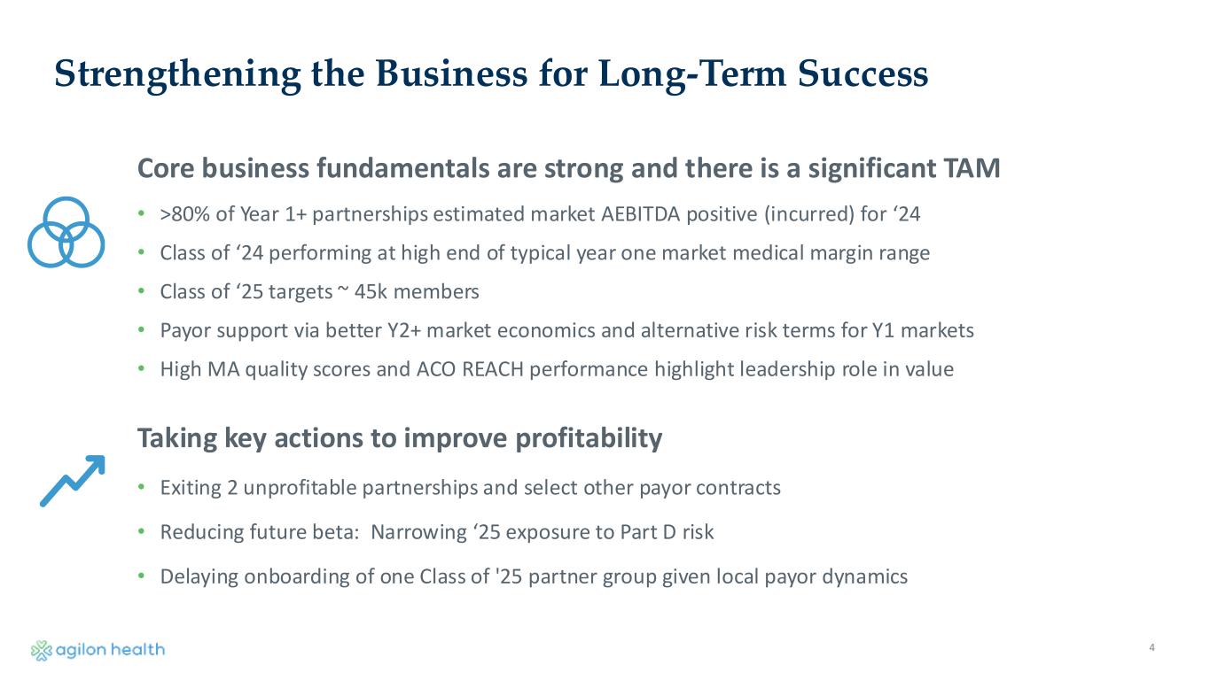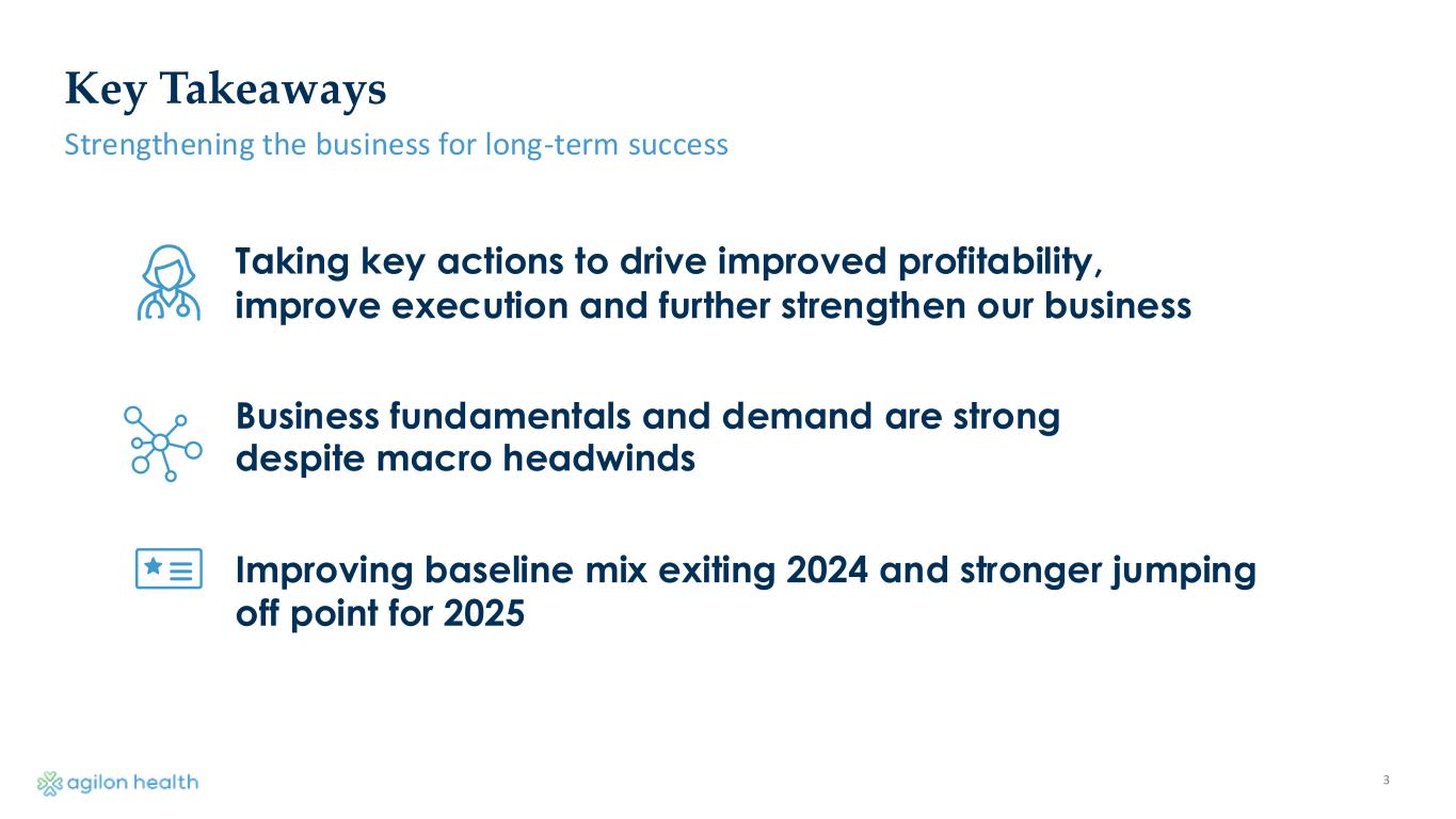 2 Disclaimers and Forward-Looking Statements FORWARD-LOOKING STATEMENTS AND OTHER INFORMATION Statements in this presentation that are not historical factual statements are “forward-looking statements” within the meaning of Section 27A of the Securities Act of 1933, as amended, and Section 21E of the Securities Exchange Act of 1934, as amended. Forward-looking statements include, among other things, statements regarding our and our officers’ intent, belief or expectation as identified by the use of words such as “believes,” “expects,” “may,” “will,” “shall,” “should,” “would,” “could,” “seeks,” “aims,” “projects,” “is optimistic,” “int ends,” “plans,” “estimates,” “anticipates” or the negative versions of these words or other comparable terms. Examples of forward-looking statements include, among other things: statements regarding timing, outcomes and other details relating to current, pending or contemplated new markets, growth opportunities, ability to deliver sustainable long-term value, demand for our products and services among PCPs and payors, busin ess environment, long-term opportunities and strategic growth plans, expected revenue and net income, total and average membership, Adjusted EBITDA, Medical Margin, geography entry costs and other financ ial projections, guidance and assumptions. Forward-looking statements reflect our current expectations and views about future events and are subject to risks and uncertainties that could significantly affect our future financial condition and results of operations. While forward-looking statements reflect our good faith belief and assumptions we believe to be reasonable based upon current information, we can give no assu rance that our expectations or forecasts will be attained. Forward-looking statements are subject to known and unknown risks and uncertainties, many of which may be outside our control. These risks and uncertainties that could cause actual results and outcomes to differ from those reflected in forward - looking statements include, but are not limited to, those factors discussed in our filings with the Securities and Exchange C ommission (the “SEC”), including the factors discussed under “Risk Factors” in our Annual Report on Form 10-K for the fiscal year ended December 31, 2023, which can be found at the SEC’s website at www.sec.gov. Except as required by law, we do not undertake, and hereby disclaim, any obligation to update any forward-looking statements, which speak only as of the date on which they are made. NON-GAAP This presentation includes references to non‐GAAP financial measures, including but not limited to Medical Margin and Adjuste d EBITDA. We believe medical margin and Adjusted EBITDA help identify underlying trends in our business and facilitate evaluation of period-to-period operating performance of our operations by eliminating items that are variable in nature and not considered by us in the evaluation of ongoing operating performance, allowing comparison of our recurring core business operating results over multiple periods. We also be lieve medical margin and Adjusted EBITDA provide useful information about our operating results, enhance the overall understanding of our past performance and future prospects, and allow for greater tran sparency with respect to key metrics we use for financial and operational decision - making. We believe medical margin and Adjusted EBITDA or similarly titled non -GAAP measures are widely used by investors, securities analysts, ratings agencies, and other parties in evaluating companies in our industry as a measure of financial performance. Other companies may calculate medical margin and Adjusted EBITDA or similarly titled non-GAAP measures differently from the way we calculate these metrics. As a result, our presentation of medical margin and Adjusted EBITDA may not be comparable to similarly titled measures of other co mpanies, limiting their usefulness as comparative measures Medical Margin and Adjusted EBITDA have limitations as analytical tools and should not be considered in isolation or as an alternative to GAAP measures or other financial statement data presented in agilon’s consolidated financial statements. Reconciliation of such non-GAAP measures to the applicable GAAP measures are set forth in the appendix. TRADEMARKS All rights to the trademarks included herein, other than the Company’s trademarks, belong to their respective owners and our use hereof does not imply any endorsement by the owners of these trademarks. Copyright © 2024 agilon health