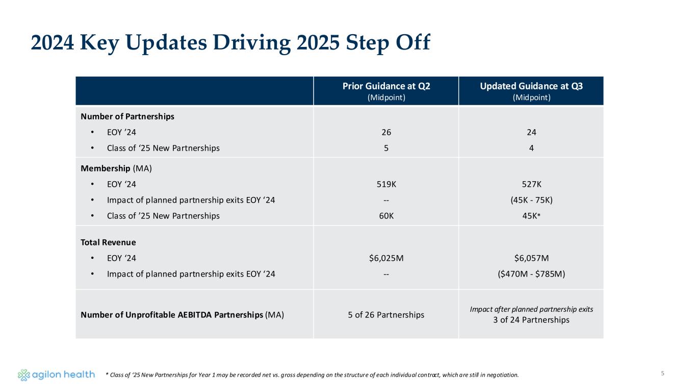 4 Strengthening the Business for Long-Term Success Core business fundamentals are strong and there is a significant TAM • >80% of Year 1+ partnerships estimated market AEBITDA positive (incurred) for ‘24 • Class of ‘24 performing at high end of typical year one market medical margin range • Class of ‘25 targets ~ 45k members • Payor support via better Y2+ market economics and alternative risk terms for Y1 markets • High MA quality scores and ACO REACH performance highlight leadership role in value Taking key actions to improve profitability • Exiting 2 unprofitable partnerships and select other payor contracts • Reducing future beta: Narrowing ‘25 exposure to Part D risk • Delaying onboarding of one Class of '25 partner group given local payor dynamics