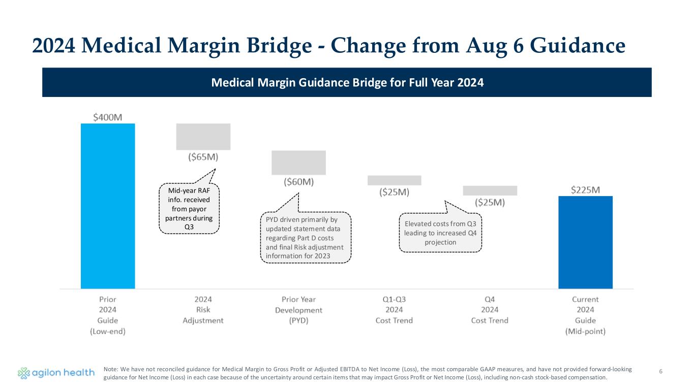 5 Prior Guidance at Q2 (Midpoint) Updated Guidance at Q3 (Midpoint) Number of Partnerships • EOY ’24 • Class of ‘25 New Partnerships 26 5 24 4 Membership (MA) • EOY ‘24 • Impact of planned partnership exits EOY ‘24 • Class of ’25 New Partnerships 519K -- 60K 527K (45K - 75K) 45K* Total Revenue • EOY ‘24 • Impact of planned partnership exits EOY ‘24 $6,025M -- $6,057M ($470M - $785M) Number of Unprofitable AEBITDA Partnerships (MA) 5 of 26 Partnerships Impact after planned partnership exits 3 of 24 Partnerships 2024 Key Updates Driving 2025 Step Off * Class of ‘25 New Partnerships for Year 1 may be recorded net vs. gross depending on the structure of each individual contract, which are still in negotiation.