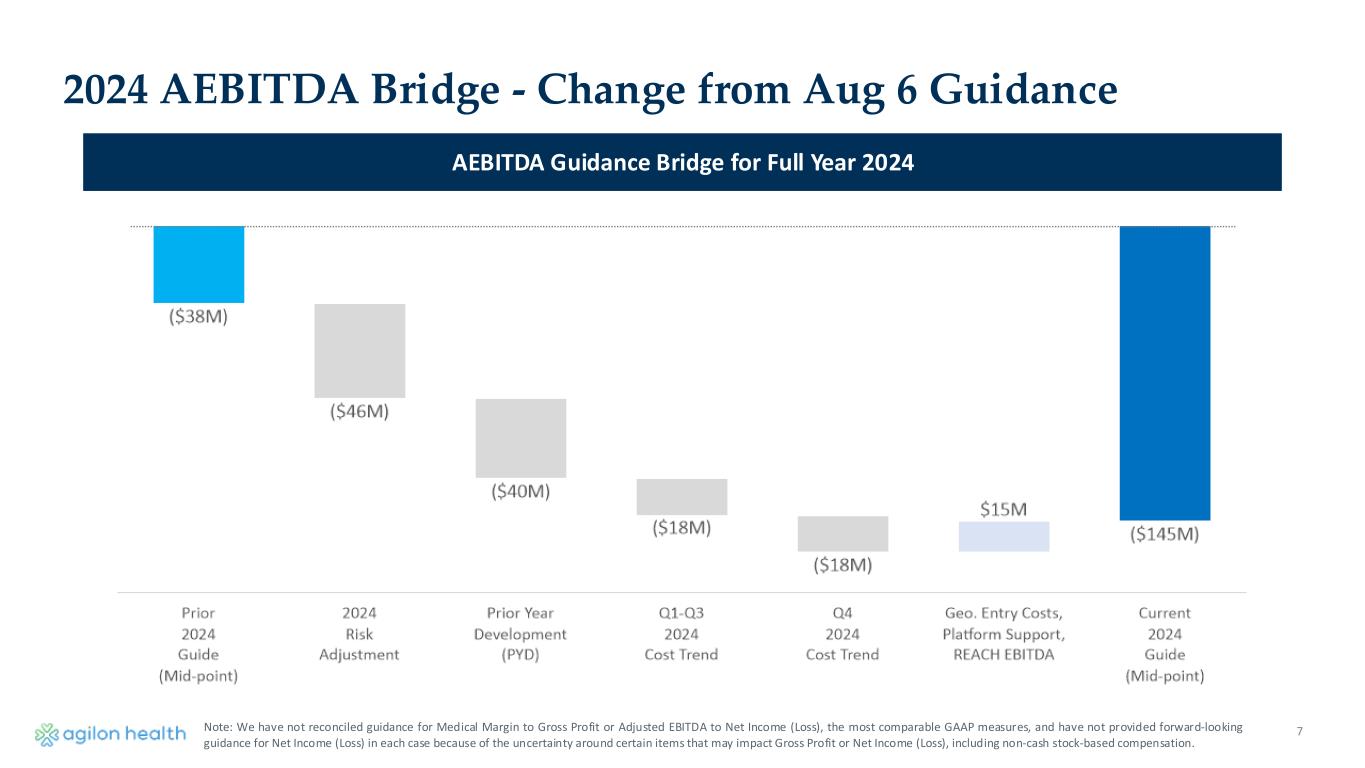 2024 Medical Margin Bridge - Change from Aug 6 Guidance Medical Margin Guidance Bridge for Full Year 2024 Note: We have not reconciled guidance for Medical Margin to Gross Profit or Adjusted EBITDA to Net Income (Loss), the most comparable GAAP measures, and have not provided forward-looking guidance for Net Income (Loss) in each case because of the uncertainty around certain items that may impact Gross Profit or Net Income (Loss), including non-cash stock-based compensation. Mid-year RAF info. received from payor partners during Q3 PYD driven primarily by updated statement data regarding Part D costs and final Risk adjustment information for 2023 Elevated costs from Q3 leading to increased Q4 projection 6