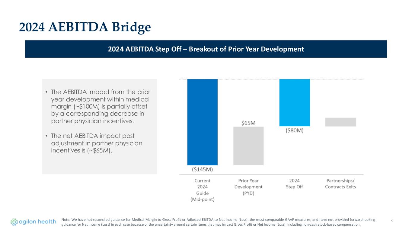 2024 Medical Margin Bridge 2024 Medical Margin Step Off – Breakout of Prior Year Development • Prior Year Development (~$100M) • Primarily driven by Part D and risk adjustment settlements (~$80M) • Medical expenses through Q3 (~$20M). • Q1 ($19M), Q2 ($21M), Q3 ($60M) • Partnerships/Contracts Exits – continued focus on profitability • Planned exit of 2 unprofitable partnerships and select payor contracts in other markets 8Note: We have not reconciled guidance for Medical Margin to Gross Profit or Adjusted EBITDA to Net Income (Loss), the most comparable GAAP measures, and have not provided forward-looking guidance for Net Income (Loss) in each case because of the uncertainty around certain items that may impact Gross Profit or Net Income (Loss), including non-cash stock-based compensation.
