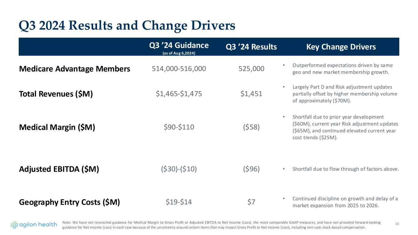 2024 AEBITDA Bridge 2024 AEBITDA Step Off – Breakout of Prior Year Development • The AEBITDA impact from the prior year development within medical margin (~$100M) is partially offset by a corresponding decrease in partner physician incentives. • The net AEBITDA impact post adjustment in partner physician incentives is (~$65M). 9Note: We have not reconciled guidance for Medical Margin to Gross Profit or Adjusted EBITDA to Net Income (Loss), the most comparable GAAP measures, and have not provided forward-looking guidance for Net Income (Loss) in each case because of the uncertainty around certain items that may impact Gross Profit or Net Income (Loss), including non-cash stock-based compensation.