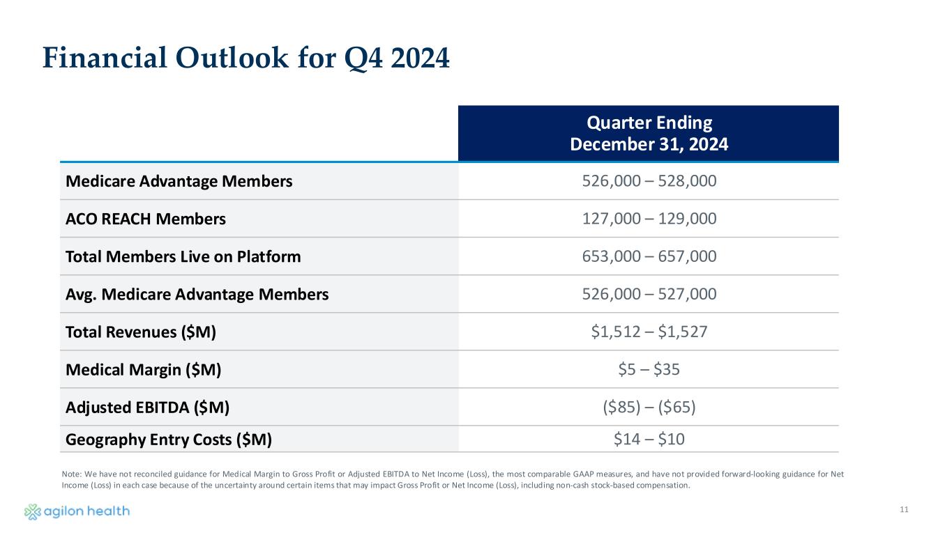 10 Q3 2024 Results and Change Drivers Q3 ’24 Guidance (as of Aug 6,2024) Q3 ’24 Results Key Change Drivers Medicare Advantage Members 514,000-516,000 525,000 • Outperformed expectations driven by same geo and new market membership growth. Total Revenues ($M) $1,465-$1,475 $1,451 • Largely Part D and Risk adjustment updates partially offset by higher membership volume of approximately ($70M). Medical Margin ($M) $90-$110 ($58) • Shortfall due to prior year development ($60M), current year Risk adjustment updates ($65M), and continued elevated current year cost trends ($25M). Adjusted EBITDA ($M) ($30)-($10) ($96) • Shortfall due to flow through of factors above. Geography Entry Costs ($M) $19-$14 $7 • Continued discipline on growth and delay of a market expansion from 2025 to 2026. Note: We have not reconciled guidance for Medical Margin to Gross Profit or Adjusted EBITDA to Net Income (Loss), the most comparable GAAP measures, and have not provided forward-looking guidance for Net Income (Loss) in each case because of the uncertainty around certain items that may impact Gross Profit or Net Income (Loss), including non-cash stock-based compensation.
