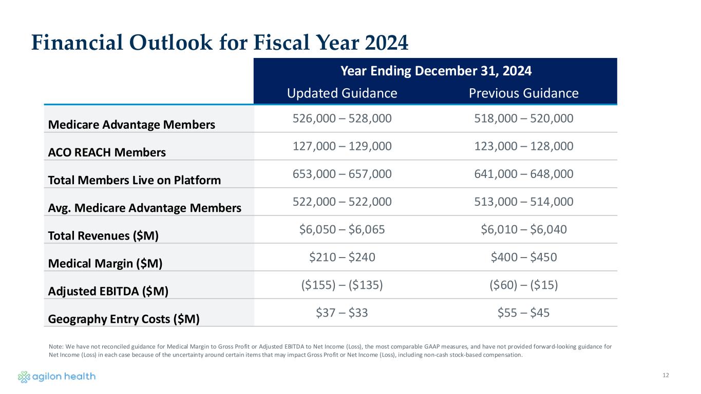 11 Quarter Ending December 31, 2024 Medicare Advantage Members 526,000 – 528,000 ACO REACH Members 127,000 – 129,000 Total Members Live on Platform 653,000 – 657,000 Avg. Medicare Advantage Members 526,000 – 527,000 Total Revenues ($M) $1,512 – $1,527 Medical Margin ($M) $5 – $35 Adjusted EBITDA ($M) ($85) – ($65) Geography Entry Costs ($M) $14 – $10 Financial Outlook for Q4 2024 Note: We have not reconciled guidance for Medical Margin to Gross Profit or Adjusted EBITDA to Net Income (Loss), the most comparable GAAP measures, and have not provided forward-looking guidance for Net Income (Loss) in each case because of the uncertainty around certain items that may impact Gross Profit or Net Income (Loss), including non-cash stock-based compensation.