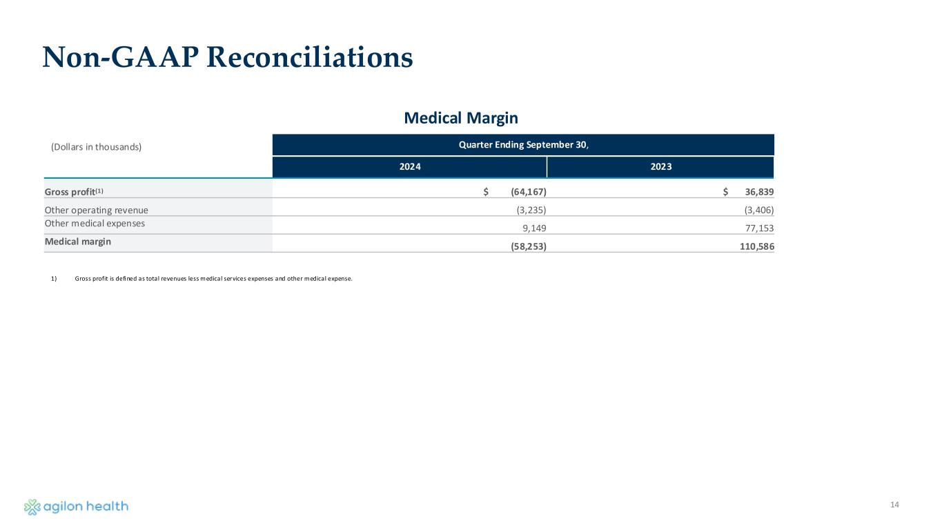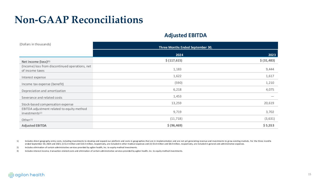 14 Non-GAAP Reconciliations (Dollars in thousands) Quarter Ending September 30, 2024 2023 Gross profit(1) $ (64,167) $ 36,839 Other operating revenue (3,235) (3,406) Other medical expenses 9,149 77,153 Medical margin (58,253) 110,586 1) Gross profit is defined as total revenues less medical services expenses and other medical expense. Medical Margin