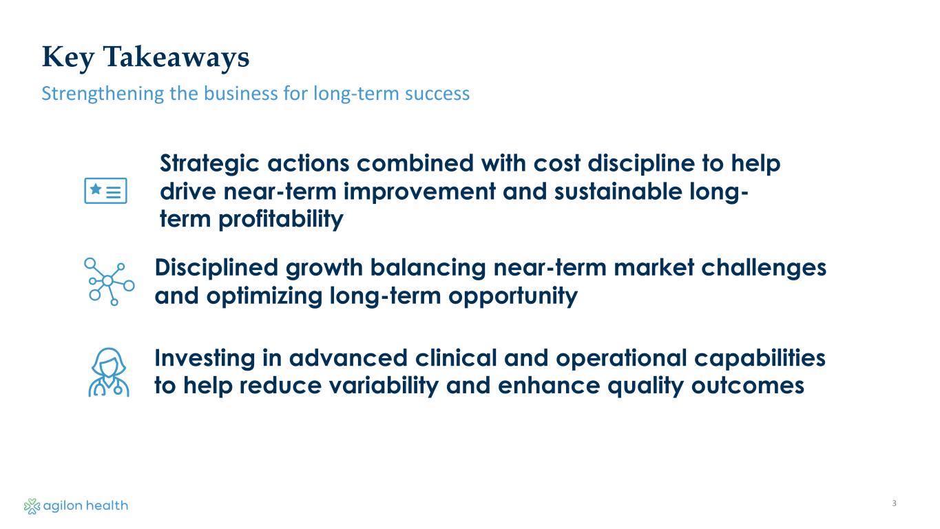 2 Disclaimers and Forward-Looking Statements FORWARD-LOOKING STATEMENTS AND OTHER INFORMATION Statements in this presentation that are not historical factual statements are “forward-looking statements” within the meaning of Section 27A of the Securities Act of 1933, as amended, and Section 21E of the Securities Exchange Act of 1934, as amended. Forward-looking statements include, among other things, statements regarding our and our officers’ intent, belief or expectation as identified by the use of words such as “believes,” “expects,” “may,” “will,” “shall,” “should,” “would,” “could,” “seeks,” “aims,” “projects,” “is optimistic,” “intends,” “plans,” “estimates,” “anticipates” or the negative versions of these words or other comparable terms. Examples of forward-looking statements include, among other things: statements regarding timing, outcomes and other details relating to current, pending or contemplated new markets, growth opportunities, expected revenue and net income, total and average membership, Adjusted EBITDA, Medical Margin, geography entry costs and other financial projections, guidance and assumptions. Forward-looking statements reflect our current expectations and views about future events and are subject to risks and uncertainties that could significantly affect our future financial condition and results of operations. While forward-looking statements reflect our good faith belief and assumptions we believe to be reasonable based upon current information, we can give no assurance that our expectations or forecasts will be attained. Forward-looking statements are subject to known and unknown risks and uncertainties, many of which may be outside our control, including but not limited to: our history of net losses and the expectation that our expenses will increase in the future; failure to identify and develop successful new geographies, physician partners and payors, or execute upon our growth initiatives; success in executing our operating strategies or achieving results consistent with our historical performance; medical expenses incurred on behalf of our members may exceed revenues we receive; our ability to maintain and secure contracts with Medicare Advantage payors on favorable terms, if at all; our ability to grow new physician partner relationships sufficient to recover startup costs; availability of additional capital, on acceptable terms or at all, to support our business in the future; significant reduction in our membership; transition to a Total Care Model may be challenging for physician partners; public health crises, such as pandemics or epidemics, could adversely affect us; inaccuracy in estimates of our members’ risk adjustment factors, medical services expense, incurred but not reported claims, and earnings pursuant to payor contracts; the impact of restrictive clauses or exclusivity provisions in some of our contracts with physician partners; our ability to hire and retain qualified personnel; our ability to realize the full value of our intangible assets; security breaches, cybersecurity attacks, loss of data and other disruptions to our information systems; our ability to protect the confidentiality of our know-how and other proprietary and internally developed information; reliance on our subsidiaries; Environmental, Social, and Governance issues; reliance on a limited number of key payors; our use of artificial intelligence; the limited terms of contracts with our payors and our ability to renew them upon expiration; our ability to navigate the changing healthcare payor market reliance on our payors, physician partners and other providers to operate our business; our ability to obtain accurate and complete diagnosis data; reliance on third-party software, data, infrastructure and bandwidth; consolidation and competition in the healthcare industry; the impact of changes to, and dependence on, federal government healthcare programs; uncertain or adverse economic and macroeconomic conditions, including a downturn or decrease in government expenditures; regulation of the healthcare industry and our and our physician partners’ ability to comply with such laws and regulations; federal and state investigations, audits and enforcement actions; repayment obligations arising out of payor audits; negative publicity regarding the managed healthcare industry generally; our use, disclosure and processing of personally identifiable information, protected health information, and de-identified data; failure to obtain or maintain an insurance license, a certificate of authority or an equivalent authorization; current and potential securities class action litigation; lawsuits not covered by insurance; changes in tax laws and regulations, or changes in related judgments or assumptions; our indebtedness and our potential to incur more debt; dependence on our subsidiaries for cash to fund all of our operations and expenses; provisions in our governing documents; ability to achieve a return on your investment depends on appreciation in the price of our common stock; and sustainability issues. These risks and uncertainties that could cause actual results and outcomes to differ from those reflected in forward-looking statements include, but are not limited to, those factors discussed in our filings with the Securities and Exchange Commission (the “SEC”), including the factors discussed under “Risk Factors” in our Annual Report on Form 10-K for the fiscal year ended December 31, 2024, which can be found at the SEC’s website at www.sec.gov. Except as required by law, we do not undertake, and hereby disclaim, any obligation to update any forward-looking statements, which speak only as of the date on which they are made. NON-GAAP This presentation includes references to non-GAAP financial measures, including but not limited to Medical Margin and Adjusted EBITDA. We believe medical margin and Adj