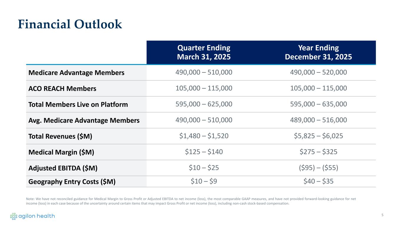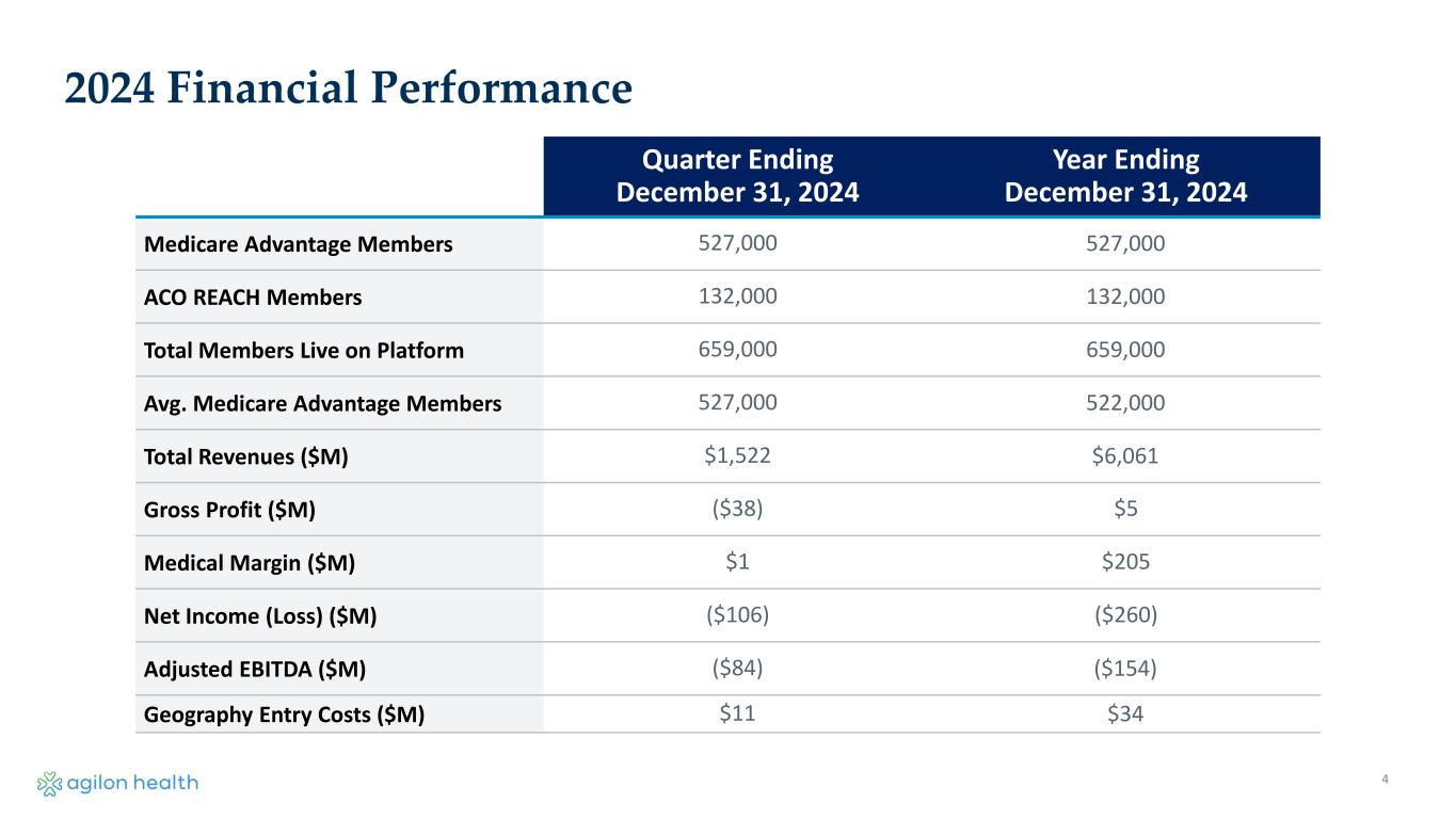 4 Quarter Ending December 31, 2024 Year Ending December 31, 2024 Medicare Advantage Members 527,000 527,000 ACO REACH Members 132,000 132,000 Total Members Live on Platform 659,000 659,000 Avg. Medicare Advantage Members 527,000 522,000 Total Revenues ($M) $1,522 $6,061 Gross Profit ($M) ($38) $5 Medical Margin ($M) $1 $205 Net Income (Loss) ($M) ($106) ($260) Adjusted EBITDA ($M) ($84) ($154) Geography Entry Costs ($M) $11 $34 2024 Financial Performance