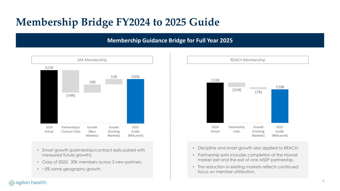 5 Quarter Ending March 31, 2025 Year Ending December 31, 2025 Medicare Advantage Members 490,000 – 510,000 490,000 – 520,000 ACO REACH Members 105,000 – 115,000 105,000 – 115,000 Total Members Live on Platform 595,000 – 625,000 595,000 – 635,000 Avg. Medicare Advantage Members 490,000 – 510,000 489,000 – 516,000 Total Revenues ($M) $1,480 – $1,520 $5,825 – $6,025 Medical Margin ($M) $125 – $140 $275 – $325 Adjusted EBITDA ($M) $10 – $25 ($95) – ($55) Geography Entry Costs ($M) $10 – $9 $40 – $35 Financial Outlook Note: We have not reconciled guidance for Medical Margin to Gross Profit or Adjusted EBITDA to net income (loss), the most comparable GAAP measures, and have not provided forward-looking guidance for net income (loss) in each case because of the uncertainty around certain items that may impact Gross Profit or net income (loss), including non-cash stock-based compensation.