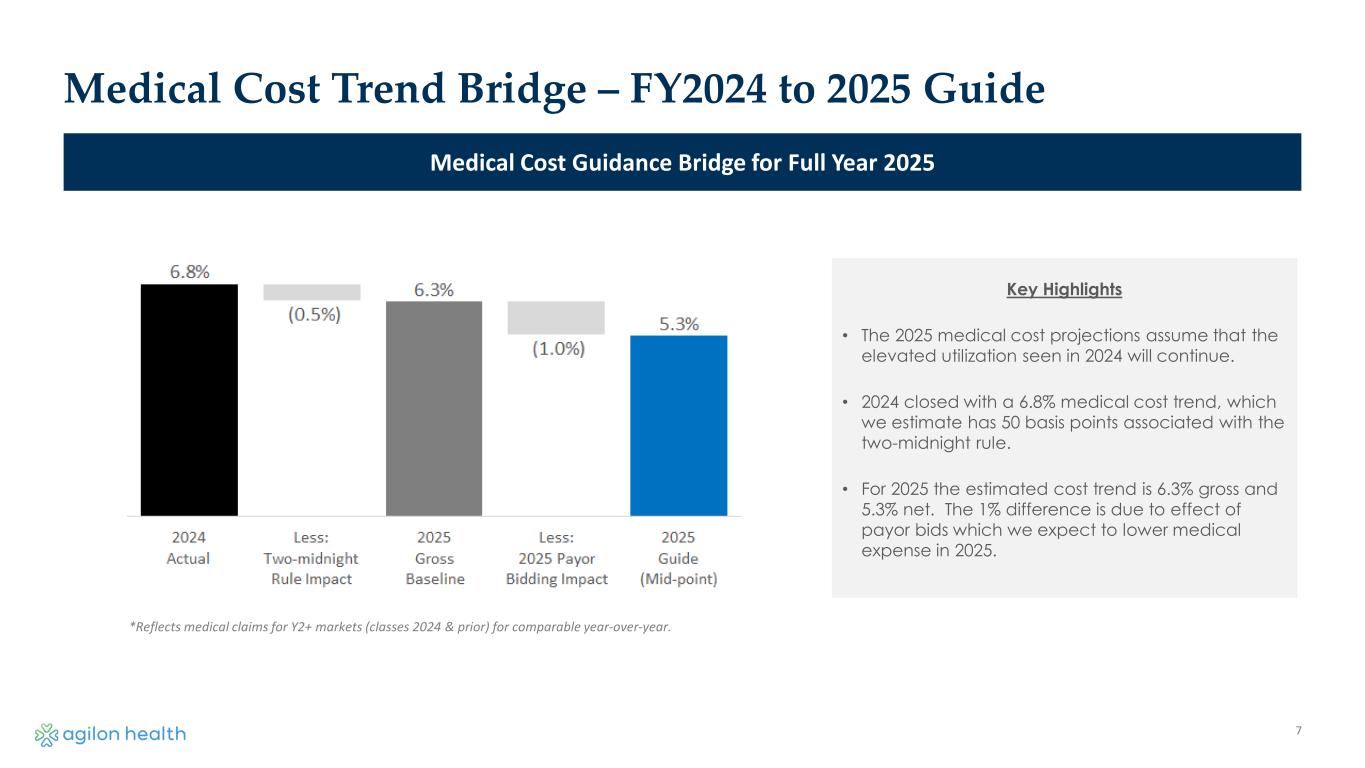 Membership Bridge FY2024 to 2025 Guide Membership Guidance Bridge for Full Year 2025 6 MA Membership REACH Membership • Smart growth (partnership/contract exits paired with measured future growth). • Class of 2025: 20K members across 3 new partners. • ~3% same geography growth. • Discipline and smart growth also applied to REACH. • Partnership exits includes completion of the Hawaii market exit and the exit of one MSSP partnership. • The reduction in existing markets reflects continued focus on member attribution.