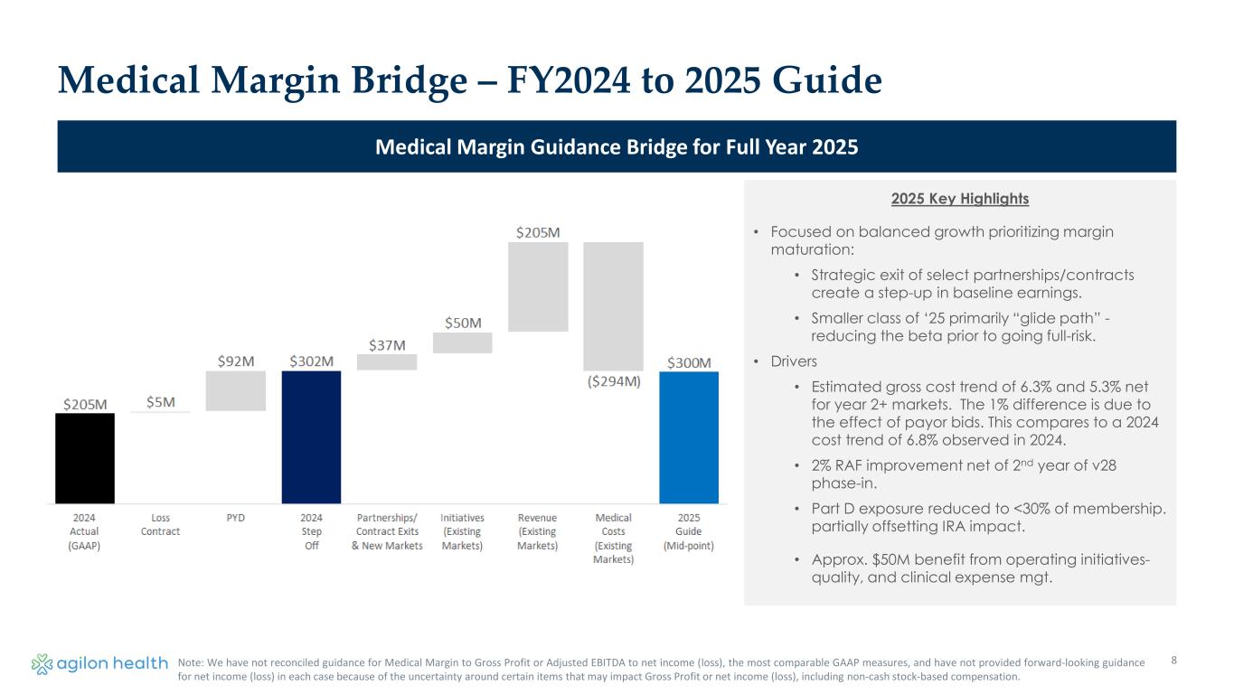 Medical Cost Trend Bridge – FY2024 to 2025 Guide Medical Cost Guidance Bridge for Full Year 2025 7 *Reflects medical claims for Y2+ markets (classes 2024 & prior) for comparable year-over-year. Key Highlights • The 2025 medical cost projections assume that the elevated utilization seen in 2024 will continue. • 2024 closed with a 6.8% medical cost trend, which we estimate has 50 basis points associated with the two-midnight rule. • For 2025 the estimated cost trend is 6.3% gross and 5.3% net. The 1% difference is due to effect of payor bids which we expect to lower medical expense in 2025.