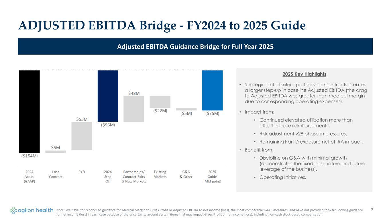 Medical Margin Bridge – FY2024 to 2025 Guide Medical Margin Guidance Bridge for Full Year 2025 8 2025 Key Highlights • Focused on balanced growth prioritizing margin maturation: • Strategic exit of select partnerships/contracts create a step-up in baseline earnings. • Smaller class of ‘25 primarily “glide path” - reducing the beta prior to going full-risk. • Drivers • Estimated gross cost trend of 6.3% and 5.3% net for year 2+ markets. The 1% difference is due to the effect of payor bids. This compares to a 2024 cost trend of 6.8% observed in 2024. • 2% RAF improvement net of 2nd year of v28 phase-in. • Part D exposure reduced to <30% of membership. partially offsetting IRA impact. • Approx. $50M benefit from operating initiatives- quality, and clinical expense mgt. Note: We have not reconciled guidance for Medical Margin to Gross Profit or Adjusted EBITDA to net income (loss), the most comparable GAAP measures, and have not provided forward-looking guidance for net income (loss) in each case because of the uncertainty around certain items that may impact Gross Profit or net income (loss), including non-cash stock-based compensation.