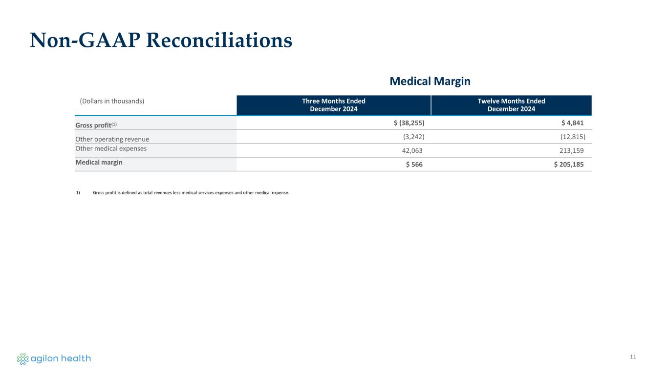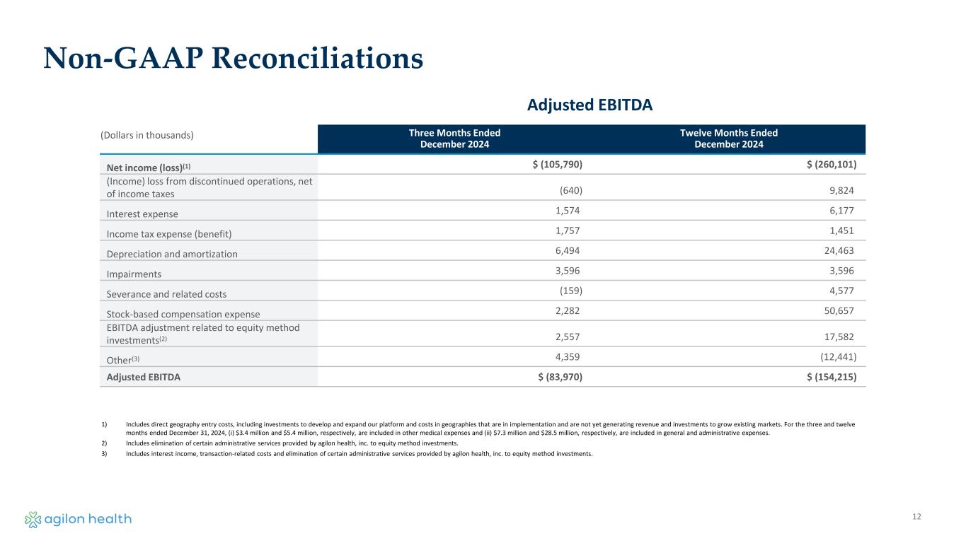 11 Non-GAAP Reconciliations (Dollars in thousands) Three Months Ended December 2024 Twelve Months Ended December 2024 Gross profit(1) $ (38,255) $ 4,841 Other operating revenue (3,242) (12,815) Other medical expenses 42,063 213,159 Medical margin $ 566 $ 205,185 1) Gross profit is defined as total revenues less medical services expenses and other medical expense. Medical Margin
