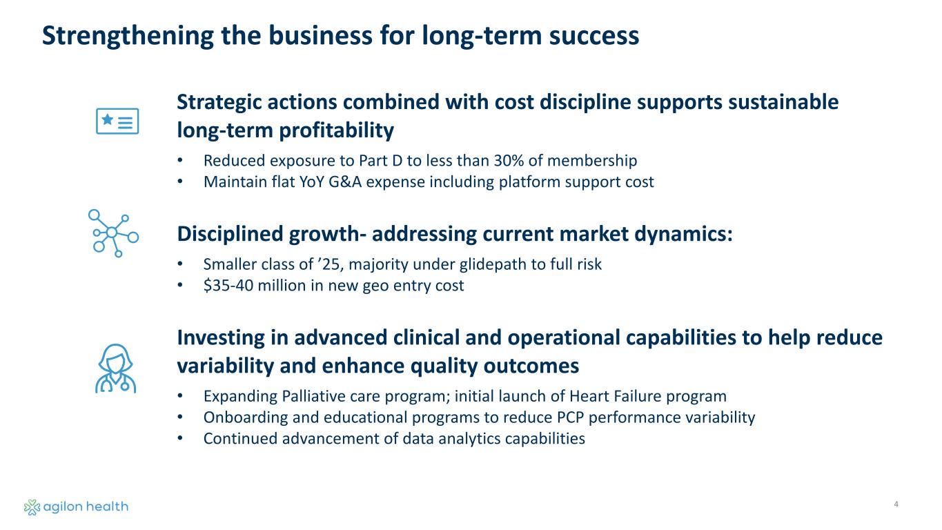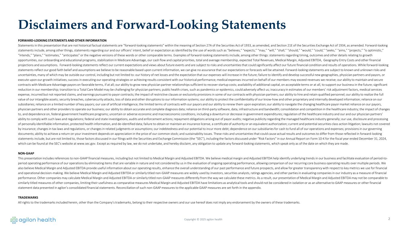 2 Disclaimers and Forward-Looking Statements FORWARD-LOOKING STATEMENTS AND OTHER INFORMATION Statements in this presentation that are not historical factual statements are “forward-looking statements” within the meaning of Section 27A of the Securities Act of 1933, as amended, and Section 21E of the Securities Exchange Act of 1934, as amended. Forward-looking statements include, among other things, statements regarding our and our officers’ intent, belief or expectation as identified by the use of words such as “believes,” “expects,” “may,” “will,” “shall,” “should,” “would,” “could,” “seeks,” “aims,” “projects,” “is optimistic,” “intends,” “plans,” “estimates,” “anticipates” or the negative versions of these words or other comparable terms. Examples of forward-looking statements include, among other things: statements regarding timing, outcomes and other details relating to growth opportunities, our onboarding and educational programs, stabilization in Medicare Advantage, our cash flow and capital priorities, total and average membership, expected Total Revenues, Medical Margin, Adjusted EBITDA, Geography Entry Costs and other financial projections and assumptions. Forward-looking statements reflect our current expectations and views about future events and are subject to risks and uncertainties that could significantly affect our future financial condition and results of operations. While forward-looking statements reflect our good faith belief and assumptions we believe to be reasonable based upon current information, we can give no assurance that our expectations or forecasts will be attained. Forward-looking statements are subject to known and unknown risks and uncertainties, many of which may be outside our control, including but not limited to: our history of net losses and the expectation that our expenses will increase in the future; failure to identify and develop successful new geographies, physician partners and payors, or execute upon our growth initiatives; success in executing our operating strategies or achieving results consistent with our historical performance; medical expenses incurred on behalf of our members may exceed revenues we receive; our ability to maintain and secure contracts with Medicare Advantage payors on favorable terms, if at all; our ability to grow new physician partner relationships sufficient to recover startup costs; availability of additional capital, on acceptable terms or at all, to support our business in the future; significant reduction in our membership; transition to a Total Care Model may be challenging for physician partners; public health crises, such as pandemics or epidemics, could adversely affect us; inaccuracy in estimates of our members’ risk adjustment factors, medical services expense, incurred but not reported claims, and earnings pursuant to payor contracts; the impact of restrictive clauses or exclusivity provisions in some of our contracts with physician partners; our ability to hire and retain qualified personnel; our ability to realize the full value of our intangible assets; security breaches, cybersecurity attacks, loss of data and other disruptions to our information systems; our ability to protect the confidentiality of our know-how and other proprietary and internally developed information; reliance on our subsidiaries; reliance on a limited number of key payors; our use of artificial intelligence; the limited terms of contracts with our payors and our ability to renew them upon expiration; our ability to navigate the changing healthcare payor market reliance on our payors, physician partners and other providers to operate our business; our ability to obtain accurate and complete diagnosis data; reliance on third-party software, data, infrastructure and bandwidth; consolidation and competition in the healthcare industry; the impact of changes to, and dependence on, federal government healthcare programs; uncertain or adverse economic and macroeconomic conditions, including a downturn or decrease in government expenditures; regulation of the healthcare industry and our and our physician partners’ ability to comply with such laws and regulations; federal and state investigations, audits and enforcement actions; repayment obligations arising out of payor audits; negative publicity regarding the managed healthcare industry generally; our use, disclosure and processing of personally identifiable information, protected health information, and de-identified data; failure to obtain or maintain an insurance license, a certificate of authority or an equivalent authorization; current and potential securities class action litigation; lawsuits not covered by insurance; changes in tax laws and regulations, or changes in related judgments or assumptions; our indebtedness and our potential to incur more debt; dependence on our subsidiaries for cash to fund all of our operations and expenses; provisions in our governing documents; ability to achieve a return on your investment depends on appreciation in the price of our common stock; and sustainability issues. These risks and uncertainties that could cause actual results and outcomes to differ from those reflected in forward-looking statements include, but are not limited to, those factors discussed in our filings with the Securities and Exchange Commission (the “SEC”), including the factors discussed under “Risk Factors” in our Annual Report on Form 10-K for the fiscal year ended December 31, 2024, which can be found at the SEC’s website at www.sec.gov. Except as required by law, we do not undertake, and hereby disclaim, any obligation to update any forward-looking statements, which speak only as of the date on which they are made. NON-GAAP This presentation includes references to non-GAAP financial measures, including but not limited to Medical Margin and Adjusted EBITDA. We believe medical margin a