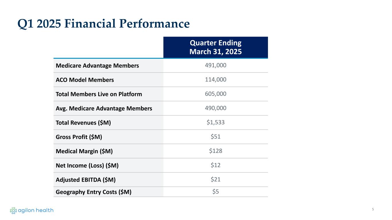 4 Strengthening the business for long-term success Strategic actions combined with cost discipline supports sustainable long-term profitability • Reduced exposure to Part D to less than 30% of membership • Maintain flat YoY G&A expense including platform support cost Disciplined growth- addressing current market dynamics: • Smaller class of ’25, majority under glidepath to full risk • $35-40 million in new geo entry cost Investing in advanced clinical and operational capabilities to help reduce variability and enhance quality outcomes • Expanding Palliative care program; initial launch of Heart Failure program • Onboarding and educational programs to reduce PCP performance variability • Continued advancement of data analytics capabilities