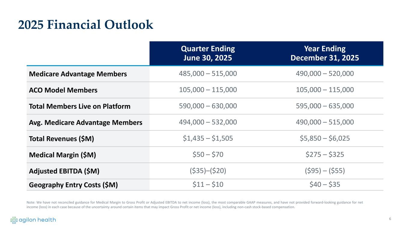 5 Quarter Ending March 31, 2025 Medicare Advantage Members 491,000 ACO Model Members 114,000 Total Members Live on Platform 605,000 Avg. Medicare Advantage Members 490,000 Total Revenues ($M) $1,533 Gross Profit ($M) $51 Medical Margin ($M) $128 Net Income (Loss) ($M) $12 Adjusted EBITDA ($M) $21 Geography Entry Costs ($M) $5 Q1 2025 Financial Performance