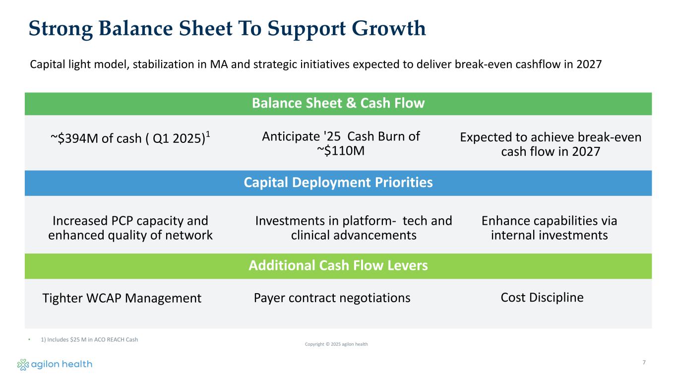 6 Quarter Ending June 30, 2025 Year Ending December 31, 2025 Medicare Advantage Members 485,000 – 515,000 490,000 – 520,000 ACO Model Members 105,000 – 115,000 105,000 – 115,000 Total Members Live on Platform 590,000 – 630,000 595,000 – 635,000 Avg. Medicare Advantage Members 494,000 – 532,000 490,000 – 515,000 Total Revenues ($M) $1,435 – $1,505 $5,850 – $6,025 Medical Margin ($M) $50 – $70 $275 – $325 Adjusted EBITDA ($M) ($35)–($20) ($95) – ($55) Geography Entry Costs ($M) $11 – $10 $40 – $35 2025 Financial Outlook Note: We have not reconciled guidance for Medical Margin to Gross Profit or Adjusted EBITDA to net income (loss), the most comparable GAAP measures, and have not provided forward-looking guidance for net income (loss) in each case because of the uncertainty around certain items that may impact Gross Profit or net income (loss), including non-cash stock-based compensation.