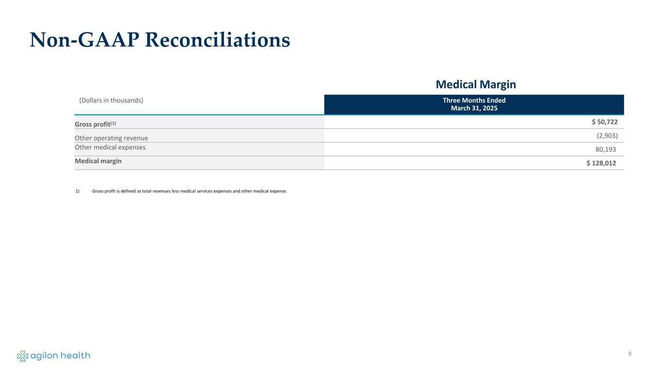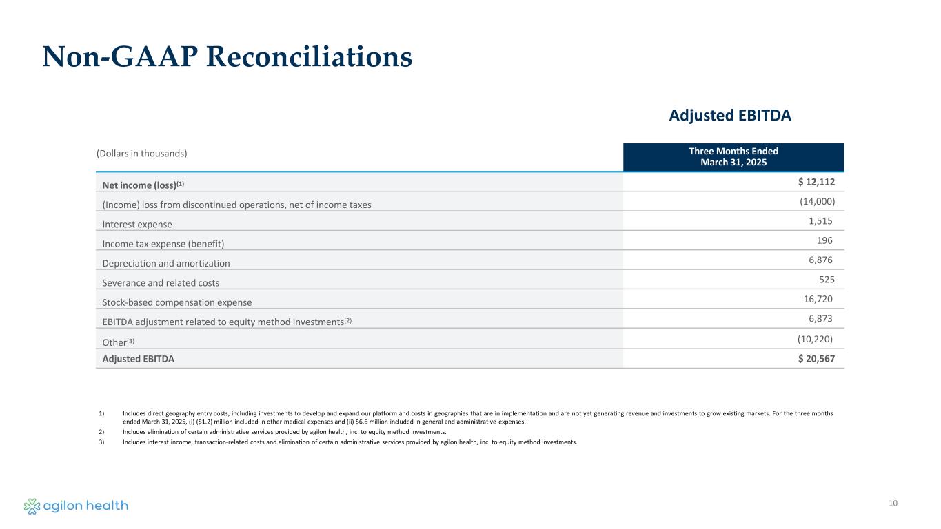 9 Non-GAAP Reconciliations (Dollars in thousands) Three Months Ended March 31, 2025 Gross profit(1) $ 50,722 Other operating revenue (2,903) Other medical expenses 80,193 Medical margin $ 128,012 1) Gross profit is defined as total revenues less medical services expenses and other medical expense. Medical Margin