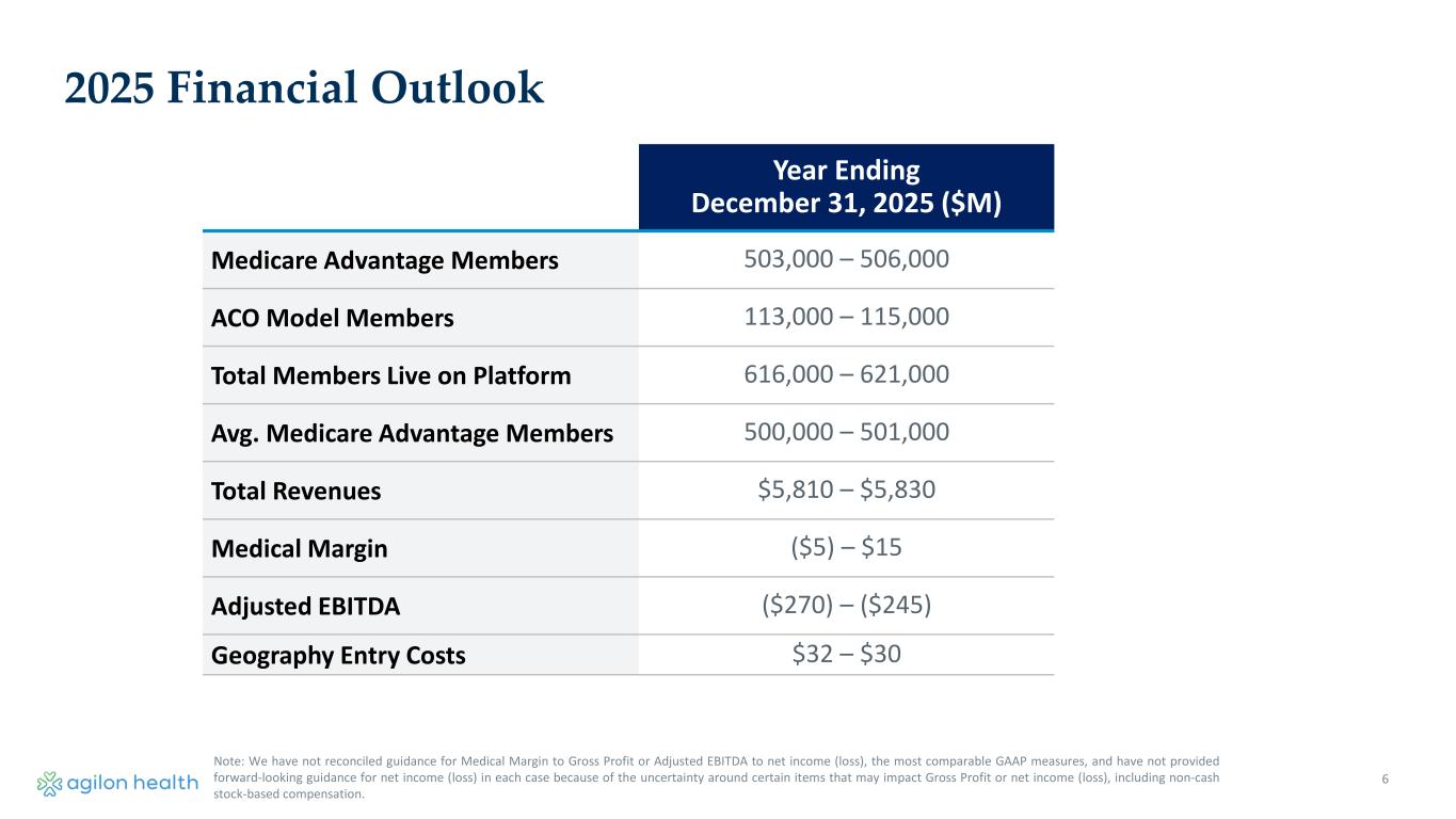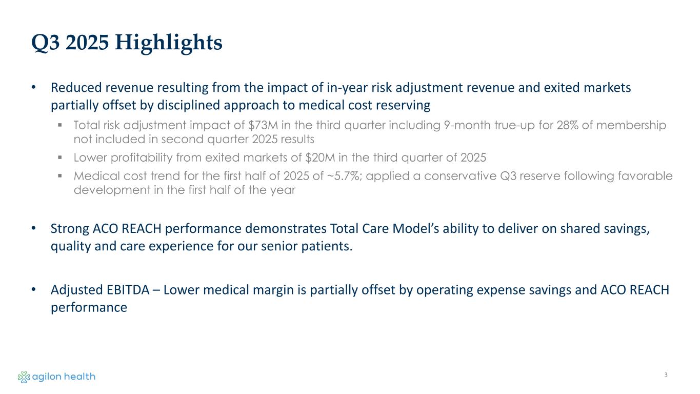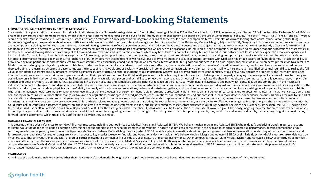 2 Disclaimers and Forward-Looking Statements FORWARD-LOOKING STATEMENTS AND OTHER INFORMATION Statements in this presentation that are not historical factual statements are “forward-looking statements” within the meaning of Section 27A of the Securities Act of 1933, as amended, and Section 21E of the Securities Exchange Act of 1934, as amended. Forward-looking statements include, among other things, statements regarding our and our officers’ intent, belief or expectation as identified by the use of words such as “believes,” “expects,” “may,” “will,” “shall,” “should,” “would,” “could,” “seeks,” “aims,” “projects,” “is optimistic,” “intends,” “plans,” “estimates,” “anticipates” or the negative versions of these words or other comparable terms. Examples of forward-looking statements include, among other things: statements regarding our expectation about levers in 2026, our cash flow and capital priorities, total and average membership, expected Total Revenues, Medical Margin, Adjusted EBITDA, Geography Entry Costs and other financial projections and assumptions, including our full year 2025 guidance. Forward-looking statements reflect our current expectations and views about future events and are subject to risks and uncertainties that could significantly affect our future financial condition and results of operations. While forward-looking statements reflect our good faith belief and assumptions we believe to be reasonable based upon current information, we can give no assurance that our expectations or forecasts will be attained. Forward-looking statements are subject to known and unknown risks and uncertainties, many of which may be outside our control, including but not limited to: our history of net losses and the expectation that our expenses will increase in the future; failure to identify and develop successful new geographies, physician partners and payors, or execute upon our growth initiatives; success in executing our operating strategies or achieving results consistent with our historical performance; medical expenses incurred on behalf of our members may exceed revenues we receive; our ability to maintain and secure additional contracts with Medicare Advantage payors on favorable terms, if at all; our ability to grow new physician partner relationships sufficient to recover startup costs; availability of additional capital, on acceptable terms or at all, to support our business in the future; significant reduction in our membership; transition to a Total Care Model may be challenging for physician partners; public health crises, such as pandemics or epidemics, could adversely affect us; inaccuracy in estimates of our members’ risk adjustment factors, medical services expense, incurred but not reported claims, and earnings pursuant to payor contracts; the impact of restrictive clauses or exclusivity provisions in some of our contracts with physician partners; our ability to hire and retain qualified personnel; our ability to realize the full value of our intangible assets; security breaches, cybersecurity attacks, loss of data and other disruptions to our information systems; our ability to protect the confidentiality of our know-how and other proprietary and internally developed information; our reliance on our subsidiaries to perform and fund their operations; our use of artificial intelligence and machine learning in our business and challenges with properly managing the development and use of these technologies; our reliance on a limited number of key payors; the limited terms of contracts with our payors and our ability to renew them upon expiration; our ability to navigate the changing healthcare payor market; our reliance on our payors, physician partners and other providers to operate our business; our ability to obtain accurate and complete diagnosis data; our reliance on third-party software, data, infrastructure and bandwidth; consolidation and competition in the healthcare industry; the impact of changes to, and dependence on, federal government healthcare programs; uncertain or adverse economic and macroeconomic conditions, including a downturn or decrease in government expenditures; regulation of the healthcare industry and our and our physician partners’ ability to comply with such laws and regulations; federal and state investigations, audits and enforcement actions; repayment obligations arising out of payor audits; negative publicity regarding the managed healthcare industry generally; our use, disclosure and processing of personally identifiable information, protected health information, and de-identified data; failure to obtain or maintain an insurance license, a certificate of authority or an equivalent authorization; changes in tax laws and regulations, or changes in related judgments or assumptions; our indebtedness and our potential to incur more debt; our dependence on our subsidiaries for cash to fund all of our operations and expenses; provisions in our governing documents; our ability to achieve a return on investment depends on appreciation in the price of our common stock; lawsuits not covered by insurance and securities class action litigation; sustainability issues; our stock price may be volatile; and risks related to management transitions, including the search for a permanent CEO, and our ability to effectively manage leadership changes . These risks and uncertainties that could cause actual results and outcomes to differ from those reflected in forward-looking statements include, but are not limited to, those factors discussed in our filings with the Securities and Exchange Commission (the “SEC”), including the factors discussed under “Risk Factors” in our Annual Report on Form 10-K for the fiscal year ended December 31, 2024, which can be found at the SEC’s website at www.sec.gov. Additionally, ongoing implementation of performance initiatives, leadership ch