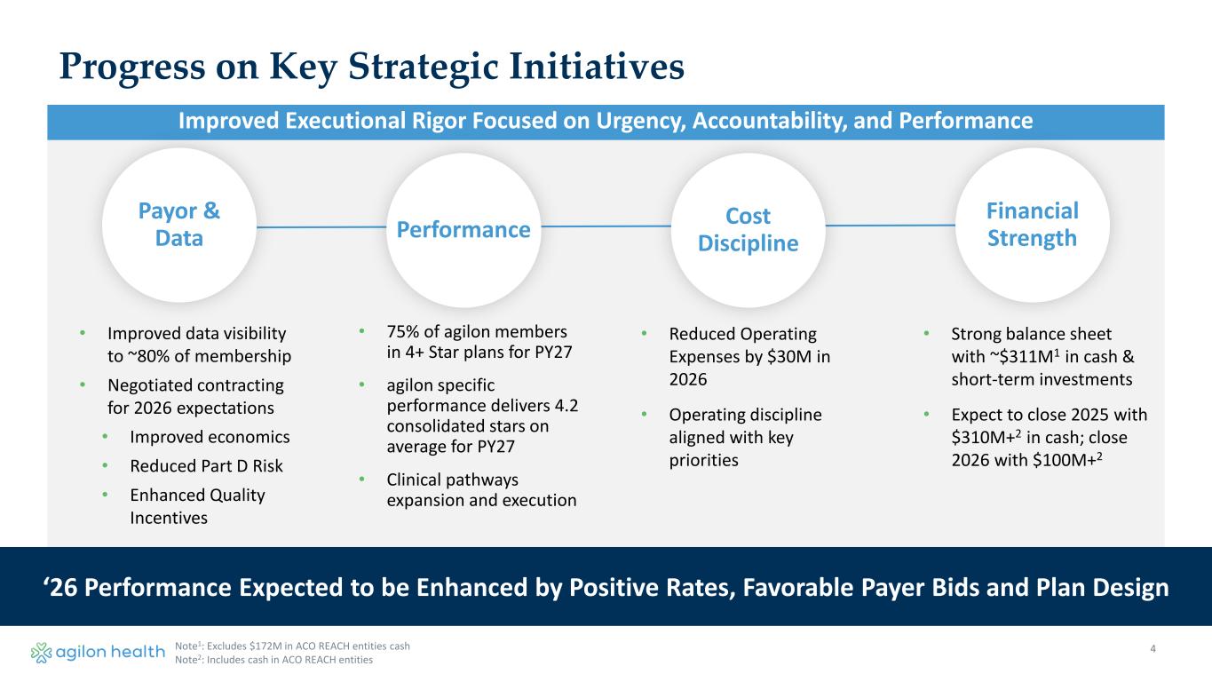 4 Improved Executional Rigor Focused on Urgency, Accountability, and Performance • 75% of agilon members in 4+ Star plans for PY27 • agilon specific performance delivers 4.2 consolidated stars on average for PY27 • Clinical pathways expansion and execution • Reduced Operating Expenses by $30M in 2026 • Operating discipline aligned with key priorities • Strong balance sheet with ~$311M1 in cash & short-term investments • Expect to close 2025 with $310M+2 in cash; close 2026 with $100M+2 Progress on Key Strategic Initiatives • Improved data visibility to ~80% of membership • Negotiated contracting for 2026 expectations • Improved economics • Reduced Part D Risk • Enhanced Quality Incentives Payor & Data Performance Cost Discipline Financial Strength Note1: Excludes $172M in ACO REACH entities cash Note2: Includes cash in ACO REACH entities ‘26 Performance Expected to be Enhanced by Positive Rates, Favorable Payer Bids and Plan Design