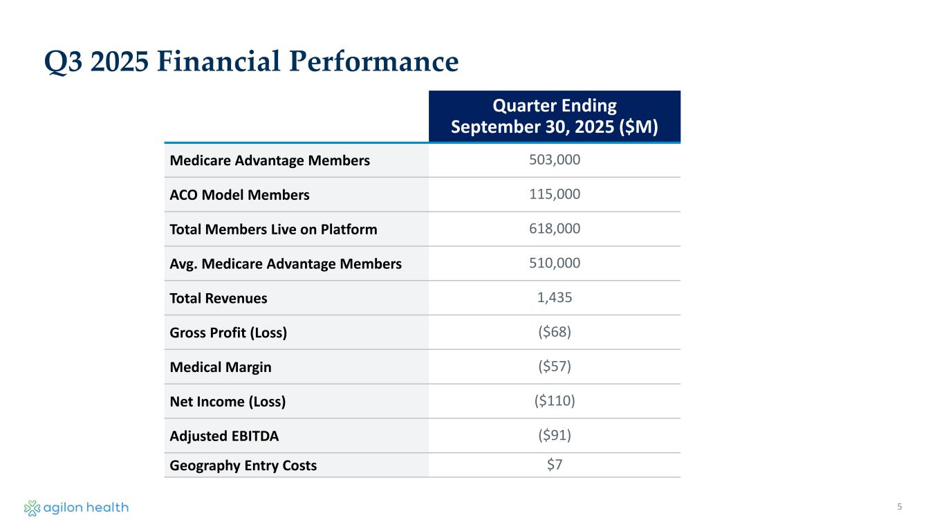 Quarter Ending September 30, 2025 ($M) Medicare Advantage Members 503,000 ACO Model Members 115,000 Total Members Live on Platform 618,000 Avg. Medicare Advantage Members 510,000 Total Revenues 1,435 Gross Profit (Loss) ($68) Medical Margin ($57) Net Income (Loss) ($110) Adjusted EBITDA ($91) Geography Entry Costs $7 Q3 2025 Financial Performance 5