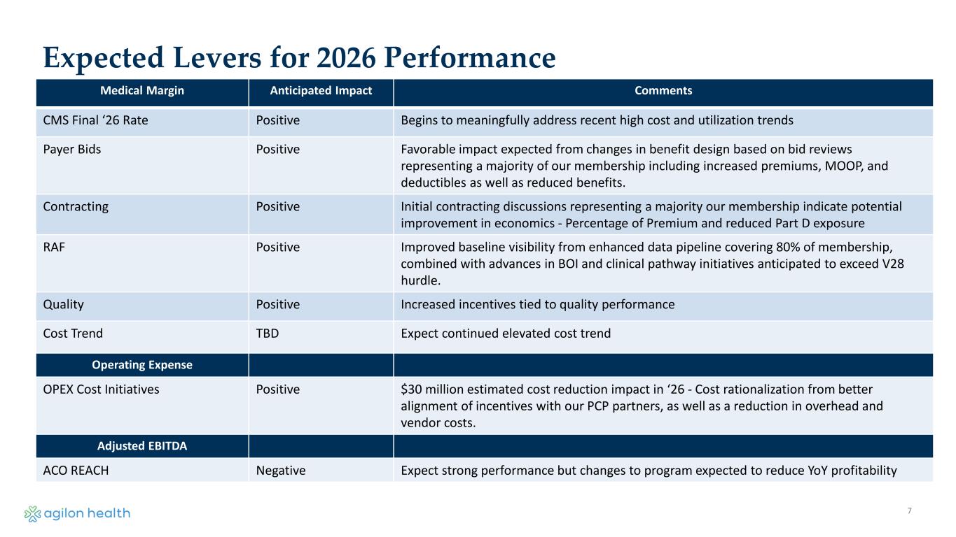 6 Year Ending December 31, 2025 ($M) Medicare Advantage Members 503,000 – 506,000 ACO Model Members 113,000 – 115,000 Total Members Live on Platform 616,000 – 621,000 Avg. Medicare Advantage Members 500,000 – 501,000 Total Revenues $5,810 – $5,830 Medical Margin ($5) – $15 Adjusted EBITDA ($270) – ($245) Geography Entry Costs $32 – $30 2025 Financial Outlook Note: We have not reconciled guidance for Medical Margin to Gross Profit or Adjusted EBITDA to net income (loss), the most comparable GAAP measures, and have not provided forward-looking guidance for net income (loss) in each case because of the uncertainty around certain items that may impact Gross Profit or net income (loss), including non-cash stock-based compensation.