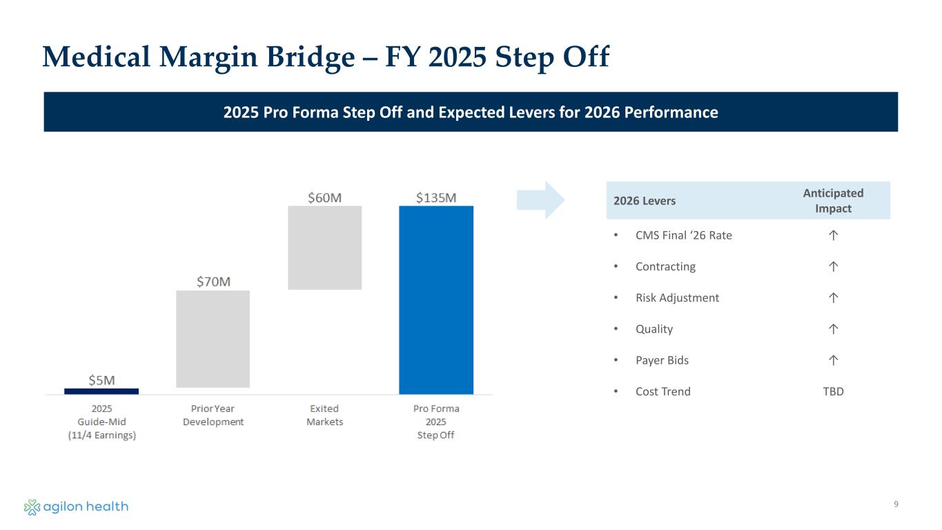 7 Expected Levers for 2026 Performance Medical Margin Anticipated Impact Comments CMS Final ‘26 Rate Positive Begins to meaningfully address recent high cost and utilization trends Payer Bids Positive Favorable impact expected from changes in benefit design based on bid reviews representing a majority of our membership including increased premiums, MOOP, and deductibles as well as reduced benefits. Contracting Positive Initial contracting discussions representing a majority our membership indicate potential improvement in economics - Percentage of Premium and reduced Part D exposure RAF Positive Improved baseline visibility from enhanced data pipeline covering 80% of membership, combined with advances in BOI and clinical pathway initiatives anticipated to exceed V28 hurdle. Quality Positive Increased incentives tied to quality performance Cost Trend TBD Expect continued elevated cost trend Operating Expense OPEX Cost Initiatives Positive $30 million estimated cost reduction impact in ‘26 - Cost rationalization from better alignment of incentives with our PCP partners, as well as a reduction in overhead and vendor costs. Adjusted EBITDA ACO REACH Negative Expect strong performance but changes to program expected to reduce YoY profitability