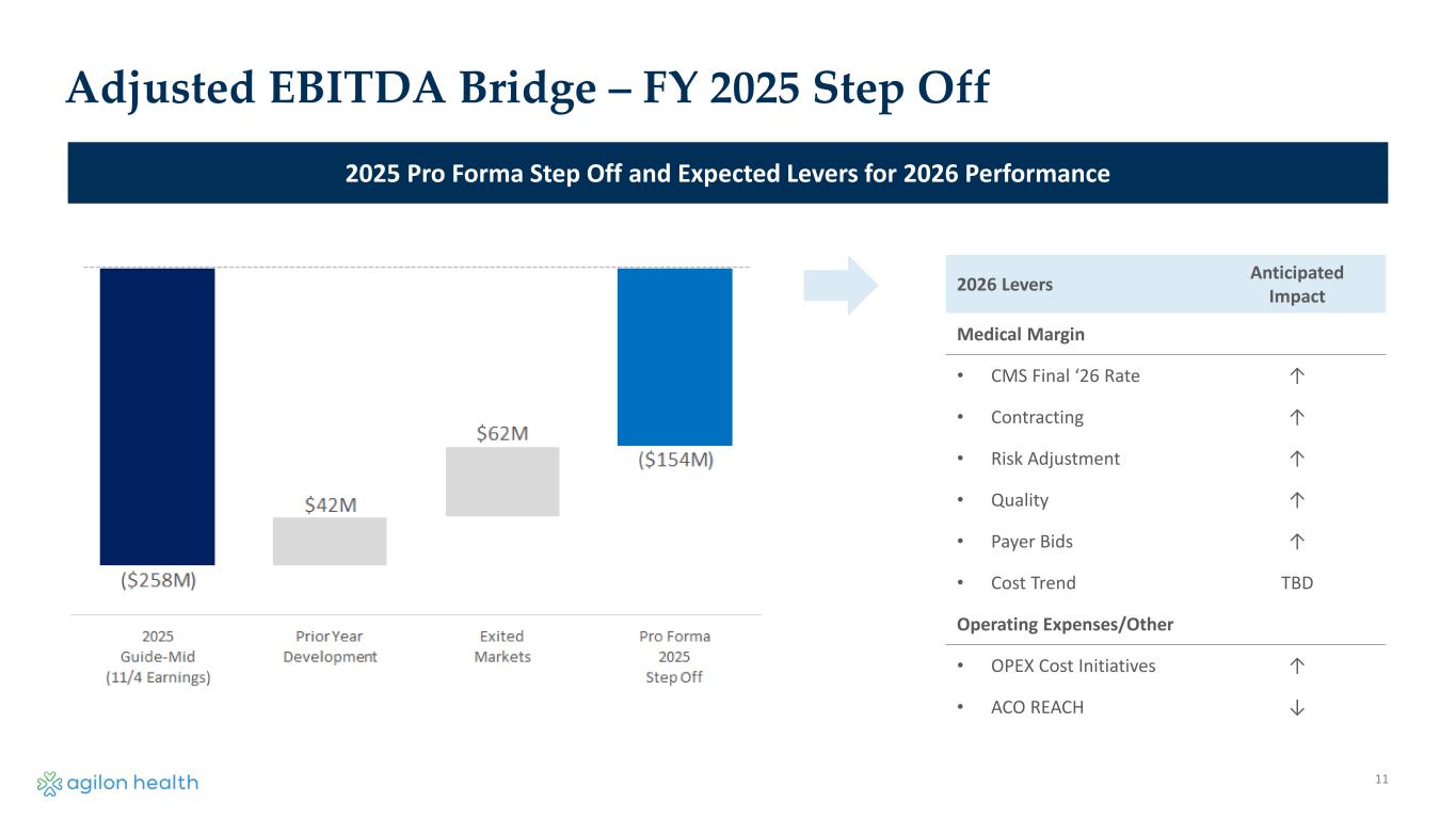 10 Adjusted EBITDA Bridge – FY 2025 Updated Guidance (mid-point) vs. Last Guidance (mid-point) provided during 2Q Earnings Release FY 2025 Financial Summary The full-year adjusted EBITDA outlook incorporates the medical margin impact, with strong REACH performance and cost actions mitigating 2025 results and positioning for stronger 2026 performance. • Medical Margin Impact: Adjusted EBITDA reflects the flow-through of medical margin changes tied to updated RAF visibility and the continued wind-down of exited markets through year-end. • Operating & Geo. Entry Expenses: Cost reduction initiatives and lower geography entry spending provided limited benefit in 2025, with savings expected to annualize and deliver approximately $30 million of adj. EBITDA improvement in 2026. • REACH EBITDA: Strong performance supported by sustained operating execution.