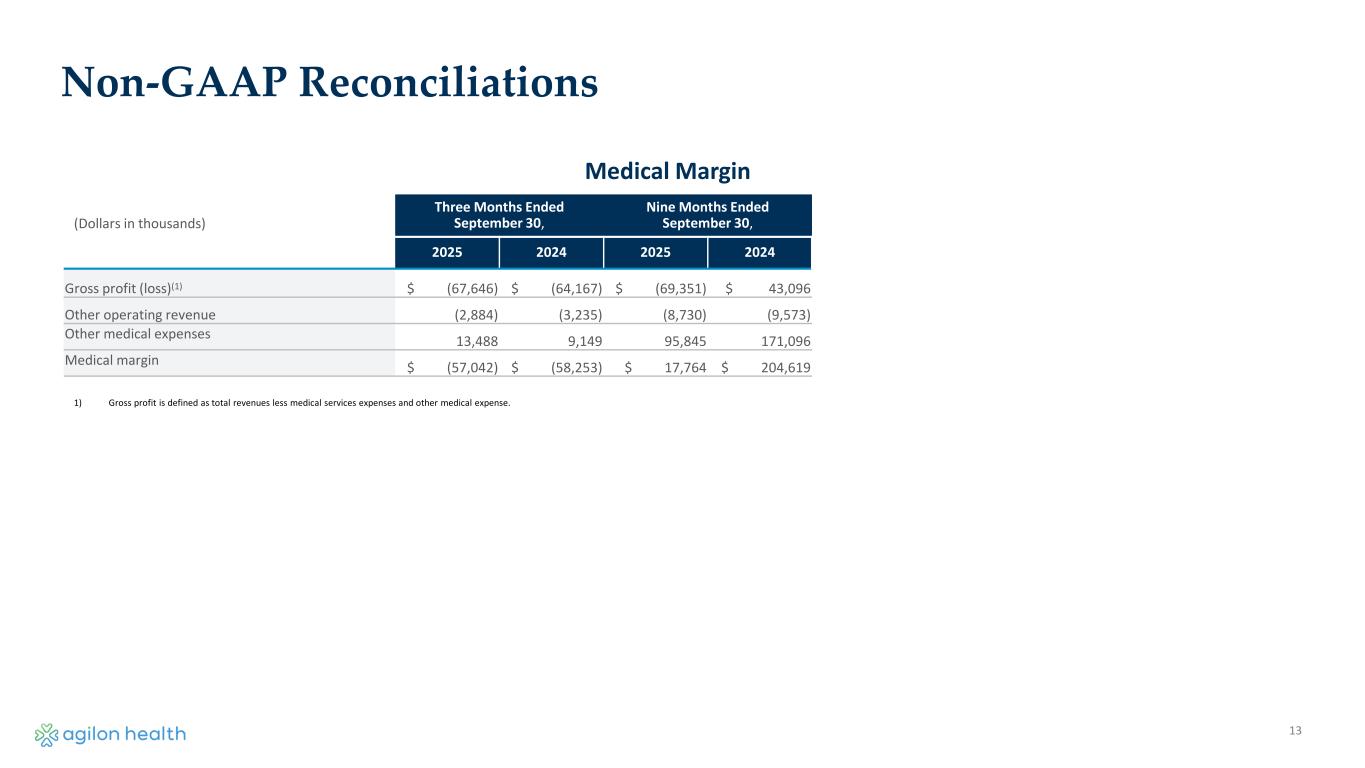 13 Non-GAAP Reconciliations (Dollars in thousands) Three Months Ended September 30, Nine Months Ended September 30, 2025 2024 2025 2024 Gross profit (loss)(1) $ (67,646) $ (64,167) $ (69,351) $ 43,096 Other operating revenue (2,884) (3,235) (8,730) (9,573) Other medical expenses 13,488 9,149 95,845 171,096 Medical margin $ (57,042) $ (58,253) $ 17,764 $ 204,619 1) Gross profit is defined as total revenues less medical services expenses and other medical expense. Medical Margin