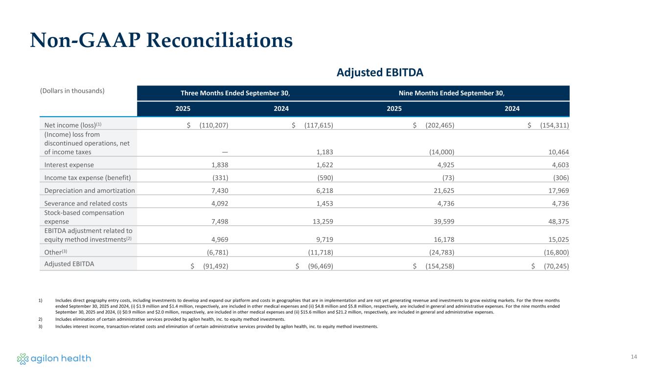14 Non-GAAP Reconciliations (Dollars in thousands) Three Months Ended September 30, Nine Months Ended September 30, 2025 2024 2025 2024 Net income (loss)(1) $ (110,207) $ (117,615) $ (202,465) $ (154,311) (Income) loss from discontinued operations, net of income taxes — 1,183 (14,000) 10,464 Interest expense 1,838 1,622 4,925 4,603 Income tax expense (benefit) (331) (590) (73) (306) Depreciation and amortization 7,430 6,218 21,625 17,969 Severance and related costs 4,092 1,453 4,736 4,736 Stock-based compensation expense 7,498 13,259 39,599 48,375 EBITDA adjustment related to equity method investments(2) 4,969 9,719 16,178 15,025 Other(3) (6,781) (11,718) (24,783) (16,800) Adjusted EBITDA $ (91,492) $ (96,469) $ (154,258) $ (70,245) 1) Includes direct geography entry costs, including investments to develop and expand our platform and costs in geographies that are in implementation and are not yet generating revenue and investments to grow existing markets. For the three months ended September 30, 2025 and 2024, (i) $1.9 million and $1.4 million, respectively, are included in other medical expenses and (ii) $4.8 million and $5.8 million, respectively, are included in general and administrative expenses. For the nine months ended September 30, 2025 and 2024, (i) $0.9 million and $2.0 million, respectively, are included in other medical expenses and (ii) $15.6 million and $21.2 million, respectively, are included in general and administrative expenses. 2) Includes elimination of certain administrative services provided by agilon health, inc. to equity method investments. 3) Includes interest income, transaction-related costs and elimination of certain administrative services provided by agilon health, inc. to equity method investments. Adjusted EBITDA