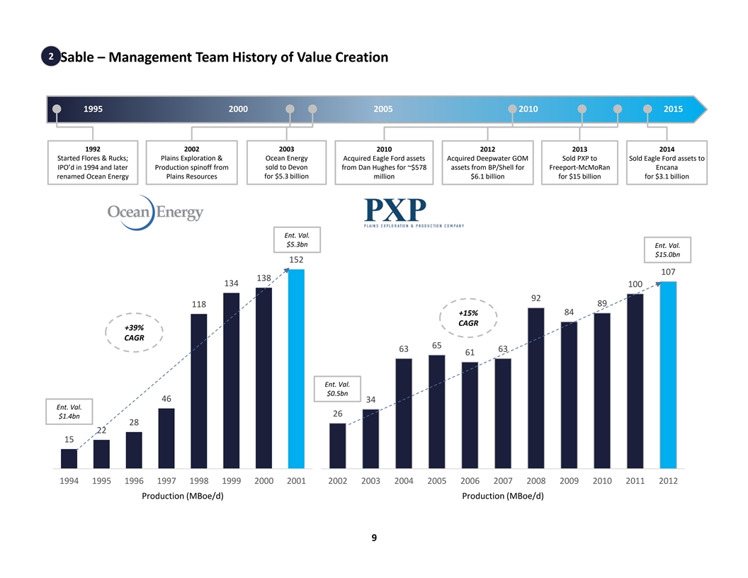 2 Sable – Management Team History of Value Creation 1995 2000 2005 2010 2015 1992 2002 2003 2010 2012 2013 2014 Started Flores & Rucks; Plains Exploration & Ocean Energy Acquired Eagle Ford assets Acquired Deepwater GOM Sold PXP to Sold Eagle Ford assets to IPO’d in 1994 and later Production spinoff from sold to Devon from Dan Hughes for ~$578 assets from BP/Shell for Freeport-McMoRan Encana renamed Ocean Energy Plains Resources for $5.3 billion million for $15 billion for $3.1 billion $6.1 billion Ent. Val. $5.3bn Ent. Val. $15.0bn 152 107 138 134 100 92 118 89 +15% 84 CAGR +39% CAGR 65 63 63 61 Ent. Val. $0.5bn 46 34 Ent. Val. 26 $1.4bn 28 22 15 1994 1995 1996 1997 1998 1999 2000 2001 2002 2003 2004 2005 2006 2007 2008 2009 2010 2011 2012 Production (MBoe/d) Production (MBoe/d) 9