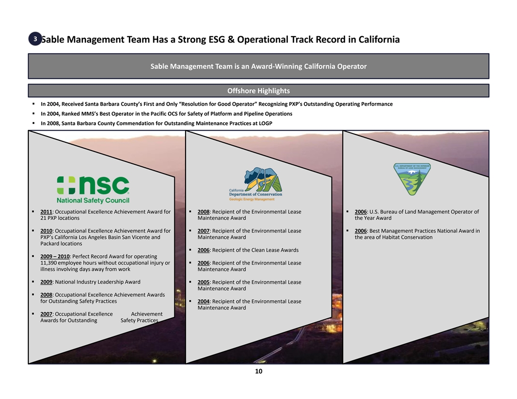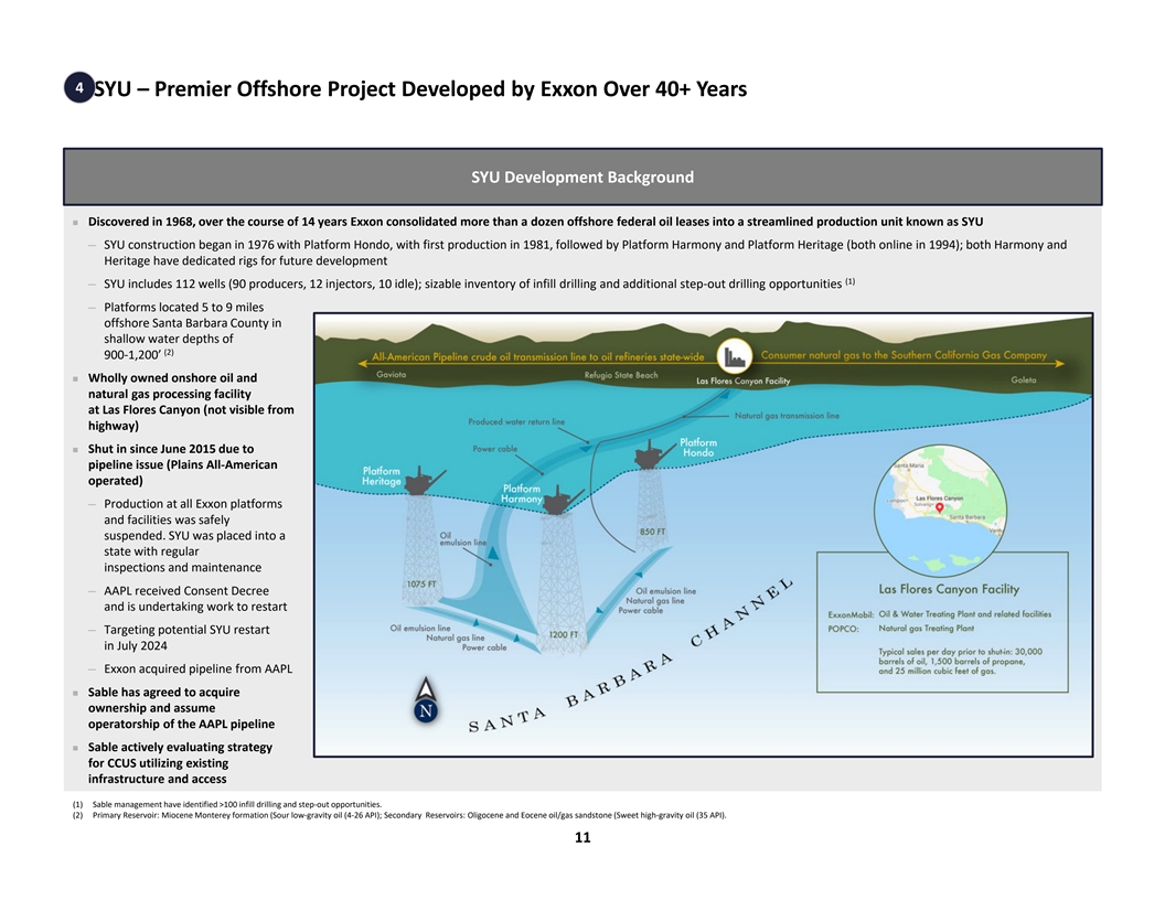 3 Sable Management Team Has a Strong ESG & Operational Track Record in California Sable Management Team is an Award-Winning California Operator Offshore Highlights § In 2004, Received Santa Barbara County’s First and Only “Resolution for Good Operator” Recognizing PXP’s Outstanding Operating Performance § In 2004, Ranked MMS’s Best Operator in the Pacific OCS for Safety of Platform and Pipeline Operations § In 2008, Santa Barbara County Commendation for Outstanding Maintenance Practices at LOGP § 2011: Occupational Excellence Achievement Award for § 2008: Recipient of the Environmental Lease § 2006: U.S. Bureau of Land Management Operator of 21 PXP locations Maintenance Award the Year Award § 2010: Occupational Excellence Achievement Award for § 2007: Recipient of the Environmental Lease § 2006: Best Management Practices National Award in PXP’s California Los Angeles Basin San Vicente and Maintenance Award the area of Habitat Conservation Packard locations § 2006: Recipient of the Clean Lease Awards § 2009 – 2010: Perfect Record Award for operating 11,390 employee hours without occupational injury or § 2006: Recipient of the Environmental Lease illness involving days away from work Maintenance Award § 2009: National Industry Leadership Award § 2005: Recipient of the Environmental Lease Maintenance Award § 2008: Occupational Excellence Achievement Awards for Outstanding Safety Practices§ 2004: Recipient of the Environmental Lease Maintenance Award § 2007: Occupational Excellence Achievement Awards Awards f for or O Outstanding utstanding Safety Safety Practices Practices 10