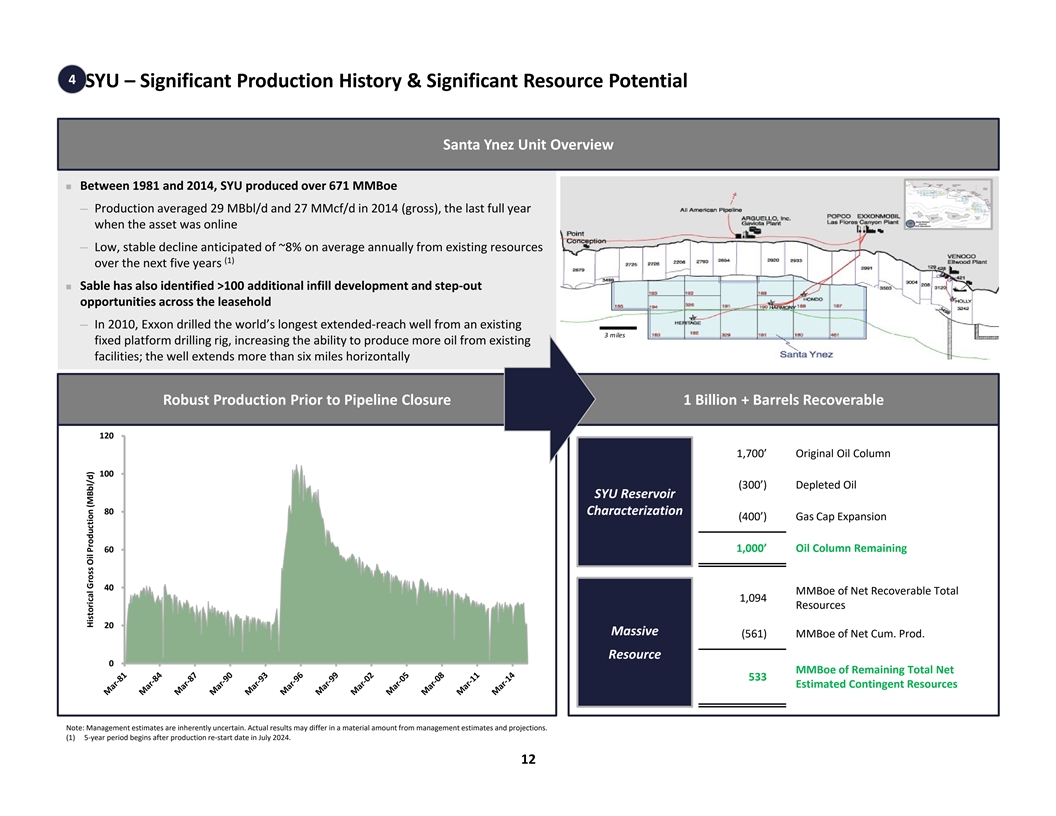 4 SYU – Premier Offshore Project Developed by Exxon Over 40+ Years SYU Development Background n Discovered in 1968, over the course of 14 years Exxon consolidated more than a dozen offshore federal oil leases into a streamlined production unit known as SYU ─ SYU construction began in 1976 with Platform Hondo, with first production in 1981, followed by Platform Harmony and Platform Heritage (both online in 1994); both Harmony and Heritage have dedicated rigs for future development (1) ─ SYU includes 112 wells (90 producers, 12 injectors, 10 idle); sizable inventory of infill drilling and additional step-out drilling opportunities ─ Platforms located 5 to 9 miles offshore Santa Barbara County in shallow water depths of (2) 900-1,200’ n Wholly owned onshore oil and natural gas processing facility at Las Flores Canyon (not visible from highway) n Shut in since June 2015 due to pipeline issue (Plains All-American Pipeline (“AAPL”) operated) ─ Production at all Exxon platforms and facilities was safely suspended. SYU was placed into a preserved state with regular inspections and maintenance ─ AAPL received Consent Decree and is undertaking work to restart ─ Targeting potential SYU restart in July 2024 ─ Exxon acquired pipeline from AAPL n Sable has agreed to acquire ownership and assume operatorship of the AAPL pipeline n Sable actively evaluating strategy for CCUS utilizing existing infrastructure and access (1) Sable management have identified >100 infill drilling and step-out opportunities. (2) Primary Reservoir: Miocene Monterey formation (Sour low-gravity oil (4-26 API); Secondary Reservoirs: Oligocene and Eocene oil/gas sandstone (Sweet high-gravity oil (35 API). 11