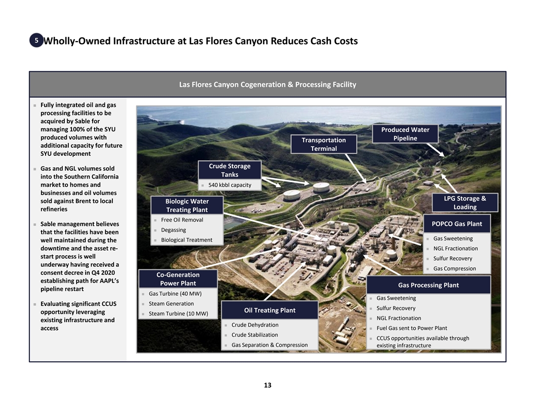 4 SYU – Significant Production History & Significant Resource Potential Santa Ynez Unit Overview n Between 1981 and 2014, SYU produced over 671 MMBoe ─ Production averaged 29 MBbl/d and 27 MMcf/d in 2014 (gross), the last full year when the asset was online ─ Low, stable decline anticipated of ~8% on average annually from existing resources (1) over the next five years n Sable has also identified >100 additional infill development and step-out opportunities across the leasehold ─ In 2010, Exxon drilled the world’s longest extended-reach well from an existing 3 miles fixed platform drilling rig, increasing the ability to produce more oil from existing facilities; the well extends more than six miles horizontally Robust Production Prior to Pipeline Closure 1 Billion + Barrels Recoverable 120 1,700’ Original Oil Column 100 (300’) Depleted Oil SYU Reservoir 80 Characterization (400’) Gas Cap Expansion 60 1,000’ Oil Column Remaining 40 MMBoe of Net Recoverable Total 1,094 Resources 20 Massive (561) MMBoe of Net Cum. Prod. Resource 0 MMBoe of Remaining Total Net 533 Estimated Contingent Resources Note: Management estimates are inherently uncertain. Actual results may differ in a material amount from management estimates and projections. (1) 5-year period begins after production re-start date in July 2024. 12 Historical Gross Oil Production (MBbl/d)