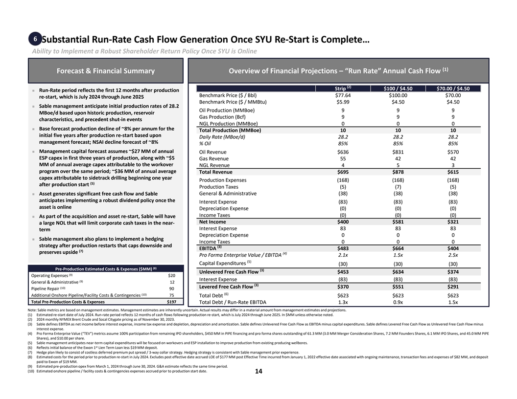 5 Wholly-Owned Infrastructure at Las Flores Canyon Reduces Cash Costs Las Flores Canyon Cogeneration & Processing Facility n Fully integrated oil and gas processing facilities to be acquired by Sable for managing 100% of the SYU Produced Water produced volumes with Pipeline Transportation additional capacity for future Terminal SYU development Crude Storage n Gas and NGL volumes sold Tanks into the Southern California market to homes and n 540 kbbl capacity businesses and oil volumes LPG Storage & sold against Brent to local Biologic Water Loading refineries Treating Plant n Free Oil Removal n Sable management believes POPCO Gas Plant n Degassing that the facilities have been n Gas Sweetening well maintained during the n Biological Treatment downtime and the asset re-n NGL Fractionation start process is well n Sulfur Recovery underway having received a n Gas Compression consent decree in Q4 2020 Co-Generation establishing path for AAPL’s Power Plant Gas Processing Plant pipeline restart n Gas Turbine (40 MW) n Gas Sweetening n Evaluating significant CCUS n Steam Generation n Sulfur Recovery Oil Treating Plant opportunity leveraging n Steam Turbine (10 MW) n NGL Fractionation existing infrastructure and n Crude Dehydration accessn Fuel Gas sent to Power Plant n Crude Stabilization n CCUS opportunities available through n Gas Separation & Compression existing infrastructure 13