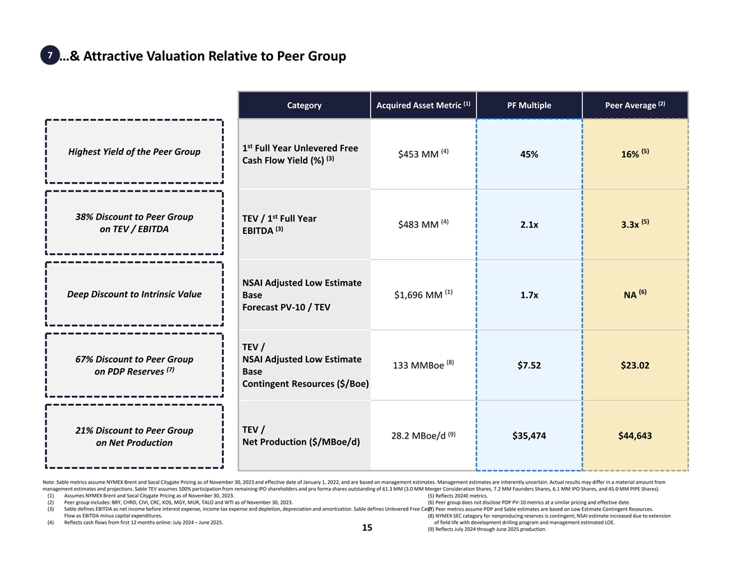 6 Substantial Run-Rate Cash Flow Generation Once SYU Re-Start is Complete… Ability to Implement a Robust Shareholder Return Policy Once SYU is Online (1) Forecast & Financial Summary Overview of Financial Projections – “Run Rate” Annual Cash Flow (2) Strip $100 / $4.50 $70.00 / $4.50 n Run-Rate period reflects the first 12 months after production Benchmark Price ($ / Bbl) $77.64 $100.00 $70.00 re-start, which is July 2024 through June 2025 Benchmark Price ($ / MMBtu) $5.99 $4.50 $4.50 n Sable management anticipate initial production rates of 28.2 Oil Production (MMBoe) 9 9 9 MBoe/d based upon historic production, reservoir Gas Production (Bcf) 9 9 9 characteristics, and precedent shut-in events NGL Production (MMBoe) 0 0 0 n Base forecast production decline of ~8% per annum for the Total Production (MMBoe) 10 10 10 initial five years after production re-start based upon Daily Rate (MBoe/d) 28.2 28.2 28.2 management forecast; NSAI decline forecast of ~8% % Oil 85% 85% 85% n Management capital forecast assumes ~$27 MM of annual Oil Revenue $636 $831 $570 ESP capex in first three years of production, along with ~$5 Gas Revenue 55 42 42 MM of annual average capex attributable to the workover NGL Revenue 4 5 3 program over the same period; ~$36 MM of annual average Total Revenue $695 $878 $615 capex attributable to sidetrack drilling beginning one year Production Expenses (168) (168) (168) (5) after production start Production Taxes (5) (7) (5) n Asset generates significant free cash flow and Sable General & Administrative (38) (38) (38) anticipates implementing a robust dividend policy once the Interest Expense (83) (83) (83) asset is online Depreciation Expense (0) (0) (0) Income Taxes (0) (0) (0) n As part of the acquisition and asset re-start, Sable will have Net Income $400 $581 $321 a large NOL that will limit corporate cash taxes in the near- Interest Expense 83 83 83 term Depreciation Expense 0 0 0 n Sable management also plans to implement a hedging Income Taxes 0 0 0 strategy after production restarts that caps downside and (3) EBITDA $483 $664 $404 (7) preserves upside (4) Pro Forma Enterprise Value / EBITDA 2.1x 1.5x 2.5x (5) Capital Expenditures (30) (30) (30) (8) Pre-Production Estimated Costs & Expenses ($MM) (3) Unlevered Free Cash Flow $453 $634 $374 (9) Operating Expenses $20 Interest Expense (83) (83) (83) (9) General & Administrative 12 (3) (10) Levered Free Cash Flow $370 $551 $291 Pipeline Repair 90 (6) (10) Additional Onshore Pipeline/Facility Costs & Contingencies 75 Total Debt $623 $623 $623 Total Pre-Production Costs & Expenses $197 Total Debt / Run-Rate EBITDA 1.3x 0.9x 1.5x Note: Sable metrics are based on management estimates. Management estimates are inherently uncertain. Actual results may differ in a material amount from management estimates and projections. (1) Estimated re-start date of July 2024. Run-rate period reflects 12 months of cash flows following production re-start, which is July 2024 through June 2025. In $MM unless otherwise noted. (2) 2024 monthly NYMEX Brent Crude and Socal Citygate pricing as of November 30, 2023. (3) Sable defines EBITDA as net income before interest expense, income tax expense and depletion, depreciation and amortization. Sable defines Unlevered Free Cash Flow as EBITDA minus capital expenditures. Sable defines Levered Free Cash Flow as Unlevered Free Cash Flow minus interest expense. (4) Pro Forma Enterprise Value (“TEV”) metrics assume 100% participation from remaining IPO shareholders, $450 MM in PIPE financing and pro forma shares outstanding of 61.3 MM (3.0 MM Merger Consideration Shares, 7.2 MM Founders Shares, 6.1 MM IPO Shares, and 45.0 MM PIPE Shares), and $10.00 per share. (5) Sable management anticipates near-term capital expenditures will be focused on workovers and ESP installation to improve production from existing producing wellbores. st (6) Reflects initial balance of the Exxon 1 Lien Term Loan less $19 MM deposit. (7) Hedge plan likely to consist of costless deferred premium put spread / 3-way collar strategy. Hedging strategy is consistent with Sable management prior experience. (8) Estimated costs for the period prior to production re-start in July 2024. Excludes post effective date accrued LOE of $177 MM post Effective Time incurred from January 1, 2022 effective date associated with ongoing maintenance, transaction fees and expenses of $82 MM, and deposit paid to Exxon of $19 MM. (9) Estimated pre-production opex from March 1, 2024 through June 30, 2024. G&A estimate reflects the same time period. (10) Estimated onshore pipeline / facility costs & contingencies expenses accrued prior to production start date. 14