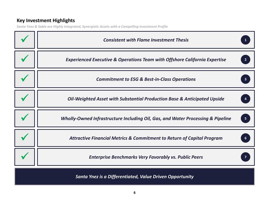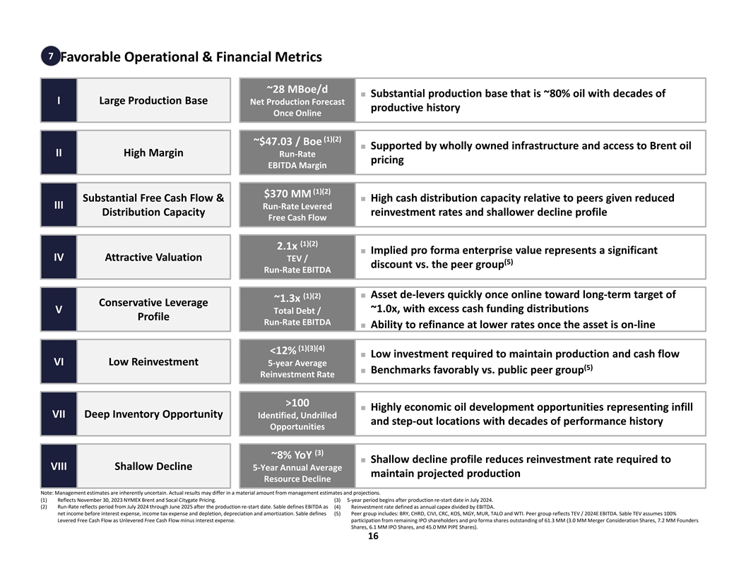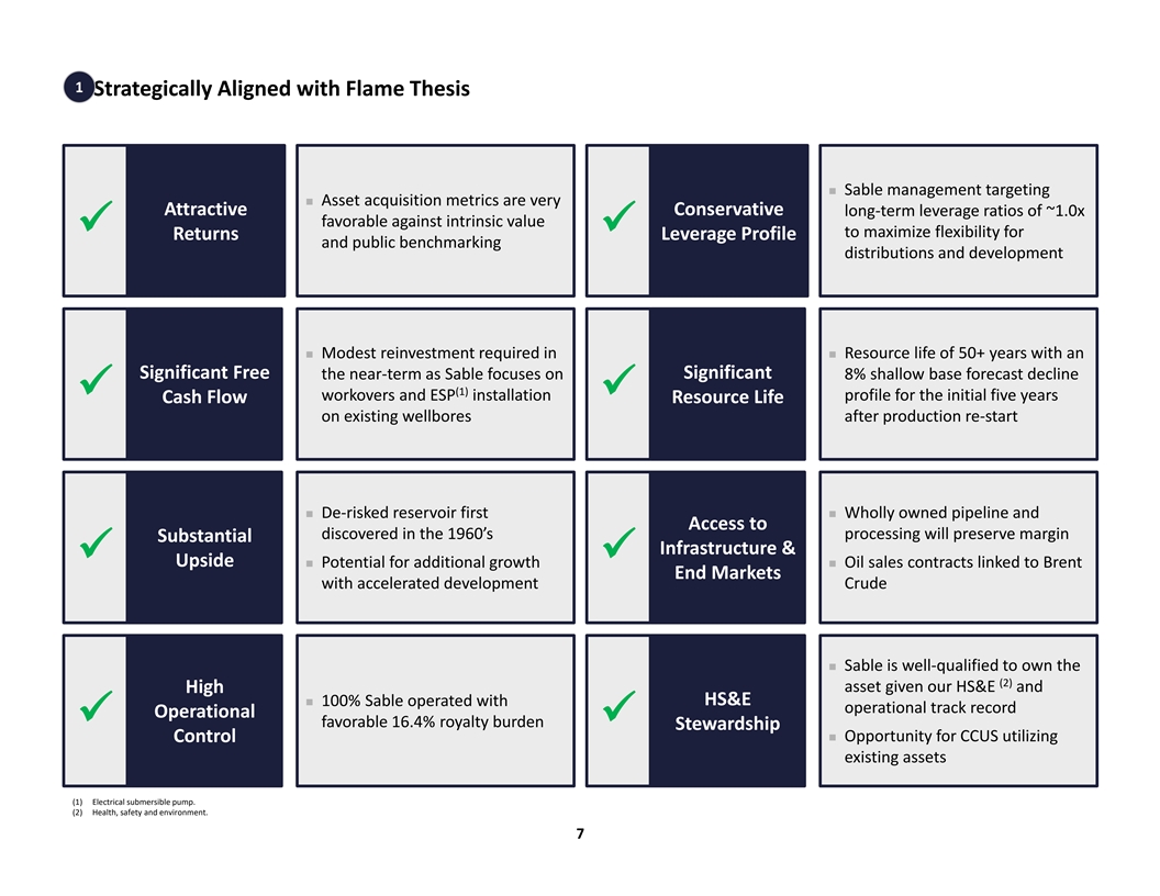 Key Investment Highlights Santa Ynez & Sable are Highly Integrated, Synergistic Assets with a Compelling Investment Profile 1 Consistent with Flame Investment Thesis ü 2 Experienced Executive & Operations Team with Offshore California Expertise ü 3 Commitment to ESG & Best-in-Class Operations ü 4 Oil-Weighted Asset with Substantial Production Base & Anticipated Upside ü 5 Wholly-Owned Infrastructure Including Oil, Gas, and Water Processing & Pipeline ü 6 Attractive Financial Metrics & Commitment to Return of Capital Program ü 7 Enterprise Benchmarks Very Favorably vs. Public Peers ü Santa Ynez is a Differentiated, Value Driven Opportunity 6