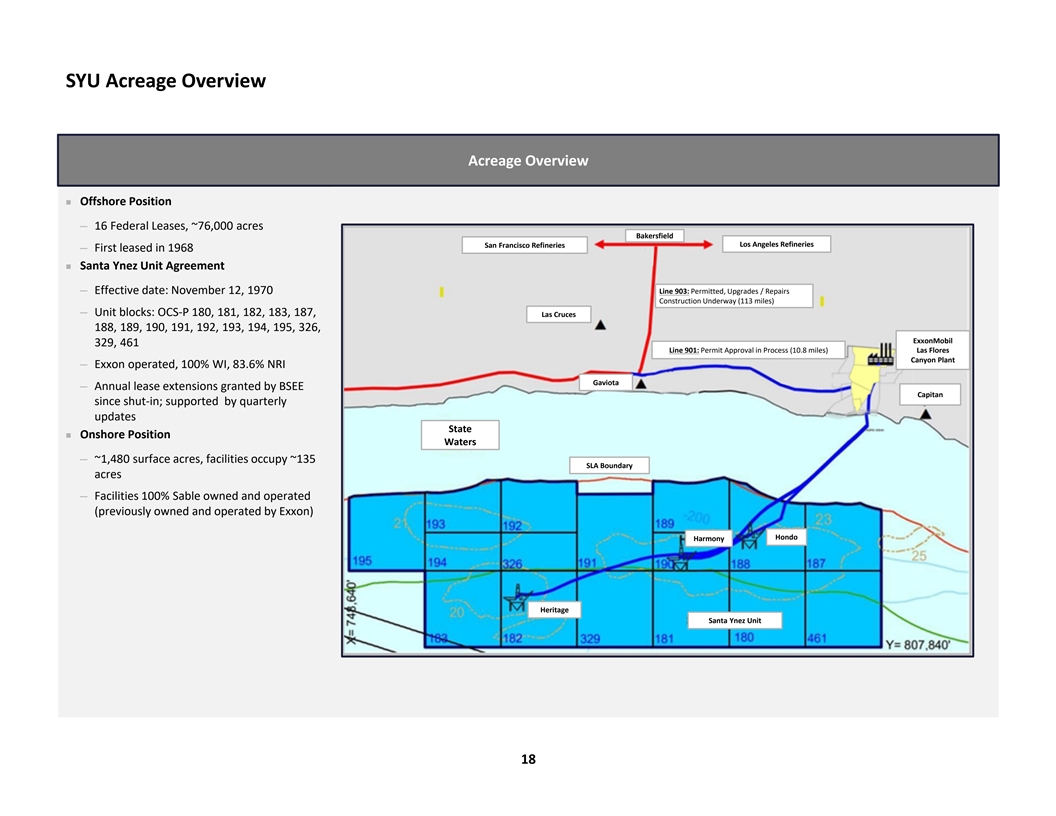 7 Favorable Operational & Financial Metrics ~28 MBoe/d n Substantial production base that is ~80% oil with decades of I Large Production Base Net Production Forecast productive history Once Online (1)(2) ~$47.03 / Boe n Supported by wholly owned infrastructure and access to Brent oil II High Margin Run-Rate pricing EBITDA Margin (1)(2) $370 MM Substantial Free Cash Flow & n High cash distribution capacity relative to peers given reduced III Run-Rate Levered Distribution Capacity reinvestment rates and shallower decline profile Free Cash Flow (1)(2) 2.1x n Implied pro forma enterprise value represents a significant IV Attractive Valuation TEV / (5) discount vs. the peer group Run-Rate EBITDA (1)(2)n Asset de-levers quickly once online toward long-term target of ~1.3x Conservative Leverage ~1.0x, with excess cash funding distributions V Total Debt / Profile Run-Rate EBITDA n Ability to refinance at lower rates once the asset is on-line (1)(3)(4) <12% n Low investment required to maintain production and cash flow VI Low Reinvestment 5-year Average (5) n Benchmarks favorably vs. public peer group Reinvestment Rate >100 n Highly economic oil development opportunities representing infill VII Deep Inventory Opportunity Identified, Undrilled and step-out locations with decades of performance history Opportunities (3) ~8% YoY n Shallow decline profile reduces reinvestment rate required to VIII Shallow Decline 5-Year Annual Average maintain projected production Resource Decline Note: Management estimates are inherently uncertain. Actual results may differ in a material amount from management estimates and projections. (1) Reflects November 30, 2023 NYMEX Brent and Socal Citygate Pricing. (3) 5-year period begins after production re-start date in July 2024. (2) Run-Rate reflects period from July 2024 through June 2025 after the production re-start date. Sable defines EBITDA as (4) Reinvestment rate defined as annual capex divided by EBITDA. net income before interest expense, income tax expense and depletion, depreciation and amortization. Sable defines (5) Peer group includes: BRY, CHRD, CIVI, CRC, KOS, MGY, MUR, TALO and WTI. Peer group reflects TEV / 2024E EBITDA. Sable TEV assumes 100% Levered Free Cash Flow as Unlevered Free Cash Flow minus interest expense. participation from remaining IPO shareholders and pro forma shares outstanding of 61.3 MM (3.0 MM Merger Consideration Shares, 7.2 MM Founders Shares, 6.1 MM IPO Shares, and 45.0 MM PIPE Shares). 16