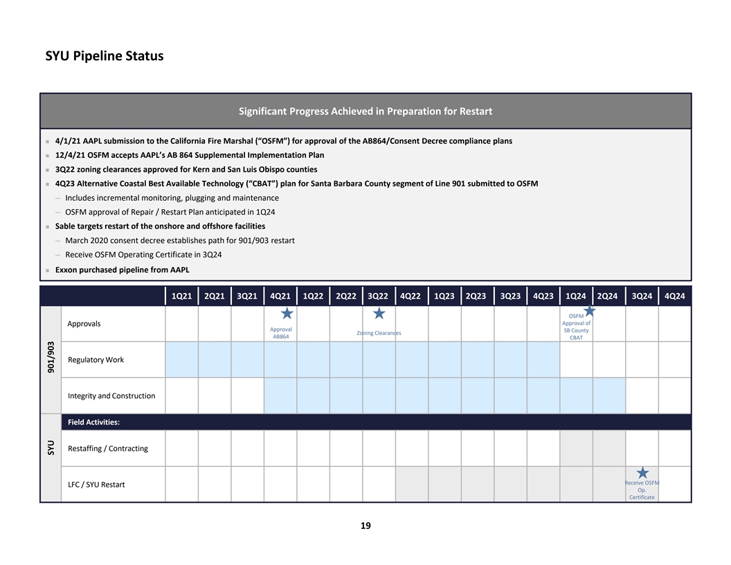 SYU Pipeline Status Significant Progress Achieved in Preparation for Restart n 4/1/21 AAPL submission to the California Fire Marshal (“OSFM”) for approval of the AB864/Consent Decree compliance plans n 12/4/21 OSFM accepts AAPL’s AB 864 Supplemental Implementation Plan n 3Q22 zoning clearances approved for Kern and San Luis Obispo counties n 4Q23 Alternative Coastal Best Available Technology (“CBAT”) plan for Santa Barbara County segment of Line 901 submitted to OSFM ─ Includes incremental monitoring, plugging and maintenance ─ OSFM approval of Repair / Restart Plan anticipated in 1Q24 n Sable targets restart of the onshore and offshore facilities ─ March 2020 consent decree establishes path for 901/903 restart ─ Receive OSFM Operating Certificate in 3Q24 n Exxon purchased pipeline from AAPL 1Q21 2Q21 3Q21 4Q21 1Q22 2Q22 3Q22 4Q22 1Q23 2Q23 3Q23 4Q23 1Q24 2Q24 3Q24 4Q24 OSFM Approval of Approvals Approval SB County Zoning Clearances AB864 CBAT Regulatory Work Integrity and Construction Field Activities: Restaffing / Contracting Receive OSFM LFC / SYU Restart Op. Certificate 19 SYU 901/903