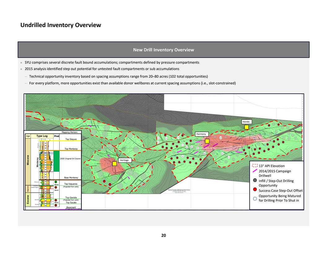 Undrilled Inventory Overview New Drill Inventory Overview n SYU comprises several discrete fault bound accumulations; compartments defined by pressure compartments n 2015 analysis identified step out potential for untested fault compartments or sub accumulations ─ Technical opportunity inventory based on spacing assumptions range from 20–80 acres (102 total opportunities) ─ For every platform, more opportunities exist than available donor wellbores at current spacing assumptions (i.e., slot-constrained) Hondo Harmony Heritage 13° API Elevation 2014/2015 Campaign Drillwell Infill / Step-Out Drilling Opportunity Success Case Step-Out Offset Opportunity Being Matured for Drilling Prior To Shut in 20
