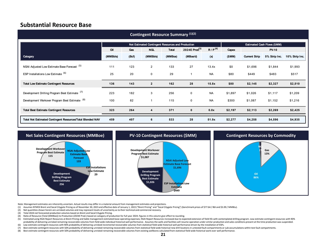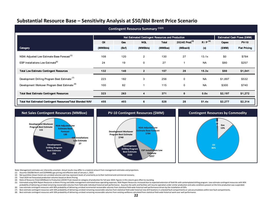 Substantial Resource Base (1)(2) Contingent Resource Summary Net Estimated Contingent Resources and Production Estimated Cash Flows ($MM) (3) (4) Oil Gas NGL Total 2024E Prod. R / P Capex PV-10 Category (MMBbls) (Bcf) (MMBbls) (MMBoe) (MBoe/d) (x) ($MM) Current Strip 5% Strip Inc. 10% Strip Inc. (5) NSAI Adjusted Low Estimate Base Forecast 111 123 2 133 27 13.4x $0 $1,696 $1,844 $1,993 (6) ESP Installations Low Estimate 25 20 0 29 1 NA $80 $449 $483 $517 Total Low Estimate Contingent Resources 136 143 2 162 28 15.8x $80 $2,145 $2,327 $2,510 (7) Development Drilling Program Best Estimate 223 182 3 256 0 NA $1,897 $1,026 $1,117 $1,209 (8) Development Workover Program Best Estimate 100 82 1 115 0 NA $300 $1,087 $1,152 $1,216 Total Best Estimate Contingent Resources 323 264 4 371 0 0.0x $2,197 $2,113 $2,269 $2,425 Total Net Estimated Contingent Resources/Total Blended NAV 459 407 6 533 28 51.9x $2,277 $4,258 $4,596 $4,935 Net Sales Contingent Resources (MMBoe) PV-10 Contingent Resources ($MM) Contingent Resources by Commodity NGL Development Workover Development Workover 1% Gas NSAI Adjusted Low Program Best Estimate 13% Program Best Estimate Estimate Base 115 $1,087 Forecast NSAI Adjusted Low 133 Estimate Base Forecast ESP Installations $1,696 Low Estimate Development Development Oil 29 Drilling Program Drilling Program 86% Best Estimate Best Estimate $1,026 ESP Installations Low 256 Estimate $449 Note: Management estimates are inherently uncertain. Actual results may differ in a material amount from management estimates and projections. (1) Assumes NYMEX Brent and Socal Citygate Pricing as of November 30, 2023 and effective date of January 1, 2022 (“Brent Pricing” and “Socal Citygate Pricing”) (benchmark prices of $77.64 / Bbl and $5.99 / MMBtu). (2) Net quantities shown herein are unrisked volumes and may represent levels of uncertainty as to their technical and commercial recovery. (3) Total 2024 net forecasted production volumes based on Brent and Socal Citygate Pricing. (4) Ratio of Resource (Total (MMBoe)) to Production (2024E Prod.) based on category of production for full year 2024. Figures in this column give effect to rounding. (5) Estimated using NSAI Report Resources at Brent Pricing and Sable management estimated lease operating expenses; NSAI Report Resources increased due to expected extension of field life with contemplated drilling program. Low estimate contingent resources with 90% probability of delivering unrisked remaining recoverable volumes from field-wide individual historical well performance. Assumes the wells and facilities will resume operation under similar production and sales conditions present at the time production was suspended. (6) Low estimate contingent resources with 90% probability of delivering unrisked incremental recoverable volumes from statistical field-wide historical well performance driven by the installation of ESPs. (7) Best estimate contingent resources with 50% probability of delivering unrisked remaining recoverable volumes from statistical field-wide historical new drill locations in untested fault compartments or sub-accumulations within test fault compartments. (8) Best estimate contingent resources with 50% probability of delivering unrisked remaining recoverable volumes from existing wellbores calculated from statistical field-wide historical work-over well performance. 21