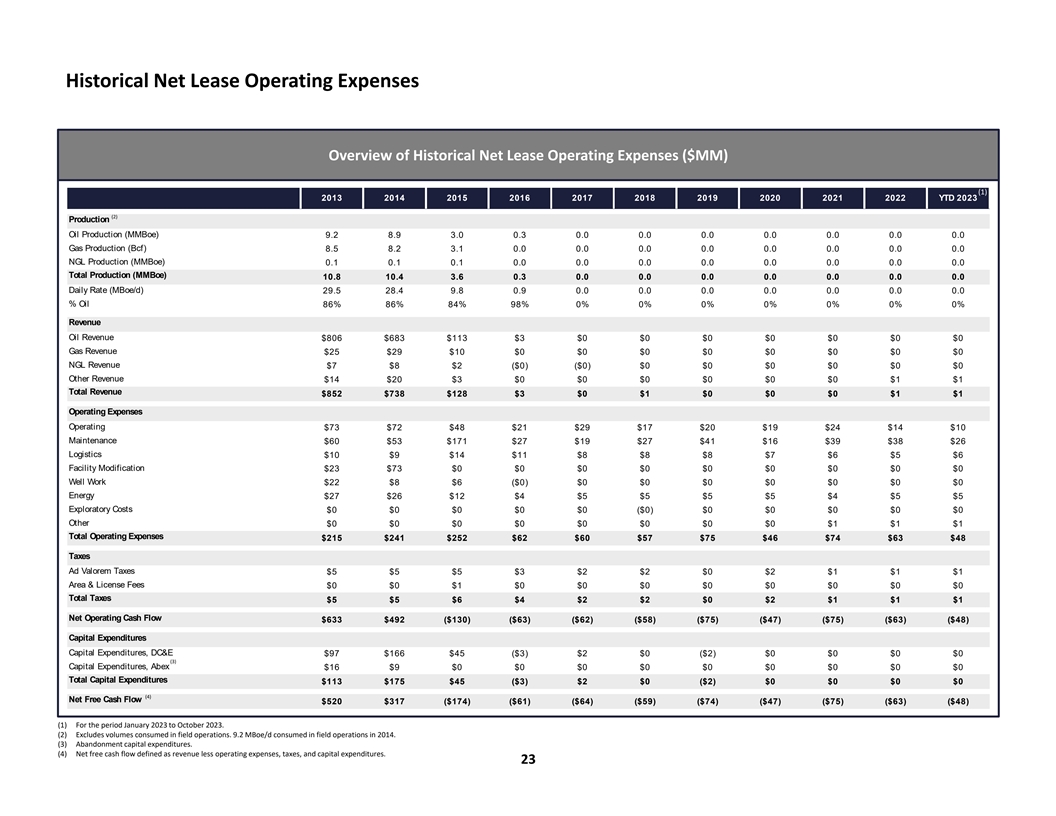 Historical Net Lease Operating Expenses Overview of Historical Net Lease Operating Expenses ($MM) (1) 2013 2014 2015 2016 2017 2018 2019 2020 2021 2022 YTD 2023 (2) Production Oil Production (MMBoe) 9.2 8.9 3.0 0.3 0.0 0.0 0.0 0.0 0.0 0.0 0.0 Gas Production (Bcf) 8.5 8.2 3.1 0.0 0.0 0.0 0.0 0.0 0.0 0.0 0.0 NGL Production (MMBoe) 0.1 0.1 0.1 0.0 0.0 0.0 0.0 0.0 0.0 0.0 0.0 Total Production (MMBoe) 10.8 10.4 3.6 0.3 0.0 0.0 0.0 0.0 0.0 0.0 0.0 Daily Rate (MBoe/d) 29.5 28.4 9.8 0.9 0.0 0.0 0.0 0.0 0.0 0.0 0.0 % Oil 86% 86% 84% 98% 0% 0% 0% 0% 0% 0% 0% Revenue Oil Revenue $806 $683 $113 $3 $0 $0 $0 $0 $0 $0 $0 Gas Revenue $25 $29 $10 $0 $0 $0 $0 $0 $0 $0 $0 NGL Revenue $7 $8 $2 ($0) ($0) $0 $0 $0 $0 $0 $0 Other Revenue $14 $20 $3 $0 $0 $0 $0 $0 $0 $1 $1 Total Revenue $852 $738 $128 $3 $0 $1 $0 $0 $0 $1 $1 Operating Expenses Operating $73 $72 $48 $21 $29 $17 $20 $19 $24 $14 $10 Maintenance $60 $53 $171 $27 $19 $27 $41 $16 $39 $38 $26 Logistics $10 $9 $14 $11 $8 $8 $8 $7 $6 $5 $6 Facility Modification $23 $73 $0 $0 $0 $0 $0 $0 $0 $0 $0 Well Work $22 $8 $6 ($0) $0 $0 $0 $0 $0 $0 $0 Energy $27 $26 $12 $4 $5 $5 $5 $5 $4 $5 $5 Exploratory Costs $0 $0 $0 $0 $0 ($0) $0 $0 $0 $0 $0 Other $0 $0 $0 $0 $0 $0 $0 $0 $1 $1 $1 Total Operating Expenses $215 $241 $252 $62 $60 $57 $75 $46 $74 $63 $48 Taxes Ad Valorem Taxes $5 $5 $5 $3 $2 $2 $0 $2 $1 $1 $1 Area & License Fees $0 $0 $1 $0 $0 $0 $0 $0 $0 $0 $0 Total Taxes $5 $5 $6 $4 $2 $2 $0 $2 $1 $1 $1 Net Operating Cash Flow $633 $492 ($130) ($63) ($62) ($58) ($75) ($47) ($75) ($63) ($48) Capital Expenditures Capital Expenditures, DC&E $97 $166 $45 ($3) $2 $0 ($2) $0 $0 $0 $0 (3) Capital Expenditures, Abex $16 $9 $0 $0 $0 $0 $0 $0 $0 $0 $0 Total Capital Expenditures $113 $175 $45 ($3) $2 $0 ($2) $0 $0 $0 $0 (4) Net Free Cash Flow $520 $317 ($174) ($61) ($64) ($59) ($74) ($47) ($75) ($63) ($48) (1) For the period January 2023 to October 2023. (2) Excludes volumes consumed in field operations. 9.2 MBoe/d consumed in field operations in 2014. (3) Abandonment capital expenditures. (4) Net free cash flow defined as revenue less operating expenses, taxes, and capital expenditures. 23