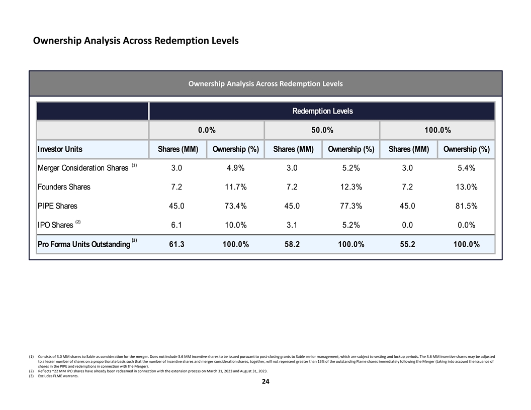 Ownership Analysis Across Redemption Levels Ownership Analysis Across Redemption Levels Redemption Levels 0.0% 50.0% 100.0% Investor Units Shares (MM) Ownership (%) Shares (MM) Ownership (%) Shares (MM) Ownership (%) (1) Merger Consideration Shares 3.0 4.9% 3.0 5.2% 3.0 5.4% Founders Shares 7.2 11.7% 7.2 12.3% 7.2 13.0% PIPE Shares 45.0 73.4% 45.0 77.3% 45.0 81.5% (2) IPO Shares 6.1 10.0% 3.1 5.2% 0.0 0.0% (3) Pro Forma Units Outstanding 61.3 100.0% 58.2 100.0% 55.2 100.0% (1) Consists of 3.0 MM shares to Sable as consideration for the merger. Does not include 3.6 MM incentive shares to be issued pursuant to post-closing grants to Sable senior management, which are subject to vesting and lockup periods. The 3.6 MM incentive shares may be adjusted to a lesser number of shares on a proportionate basis such that the number of incentive shares and merger consideration shares, together, will not represent greater than 15% of the outstanding Flame shares immediately following the Merger (taking into account the issuance of shares in the PIPE and redemptions in connection with the Merger). (2) Reflects ~22 MM IPO shares have already been redeemed in connection with the extension process on March 31, 2023 and August 31, 2023. (3) Excludes FLME warrants. 24