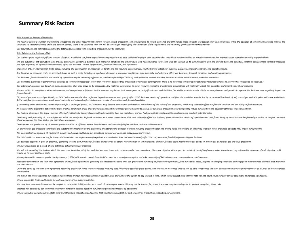 Summary Risk Factors Risks Related to Restart of Production We need to satisfy a number of permitting obligations and other requirements before we can restart production. The requirements to restart Lines 901 and 903 include those set forth in a federal court consent decree. While the operator of the lines has satisfied most of the conditions to restart including under the consent decree, there is no assurance that we will be successful in satisfying the remainder of the requirements and restarting production in a timely manner. Our assumptions and estimates regarding the total costs associated with restarting production may be inaccurate. Risks Related to the Business of SYU Our business plans require significant amount of capital. In addition, our future capital needs may require us to issue additional equity or debt securities that may dilute our shareholders or introduce covenants that may restrict our operations or ability to pay dividends. We are subject to anti-corruption, anti-bribery, anti-money laundering, financial and economic sanctions and similar laws, and noncompliance with such laws can subject us to administrative, civil and criminal fines and penalties, collateral consequences, remedial measures and legal expenses, all of which could adversely affect out business, results of operations, financial condition, and reputation. Changes in U.S. or international trade policy, including the continuation or imposition of tariffs and the resulting consequences, could adversely affect our business, prospects, financial condition, and operating results. Any financial or economic crisis, or perceived threat of such a crisis, including a significant decrease in consumer confidence, may materially and adversely affect our business, financial condition, and results of operations. Our business, financial condition and results of operations may be adversely affected by pandemics (including COVID-19) and epidemics, natural disasters, terrorist activities, political unrest, and other outbreaks. Our estimated quantities of petroleum are classified as “contingent resources” rather than “reserves” because they are subject to numerous contingencies. There is no assurance that any of the estimated resources will ever be recovered or reclassified as “reserves.” Our estimated resources are based on many assumptions that may prove to be inaccurate. Any material inaccuracies in these resource estimates or underlying assumptions will materially affect the quantities and present value of our resources. We are subject to compliance with environmental and occupational safety and health laws and regulations that may expose us to significant costs and liabilities. Our ability to retain and/or obtain necessary licenses and permits to operate the business may negatively impact our financial results. Oil, natural gas and natural gas liquids, or “NGL” prices are volatile, due to factors beyond our control, and greatly affect SYU’s business, results of operations and financial condition. Any decline in, or sustained low levels of, oil, natural gas and NGL prices will cause a decline in SYU’s cash flow from operations, which could materially and adversely affect its business, results of operations and financial condition. If commodity prices decline and remain depressed for a prolonged period, SYU’s business may become uneconomic and result in write downs of the value of our properties, which may adversely affect our financial condition and our ability to fund operations. An increase in the differential between the Brent or other benchmark prices of oil and natural gas and the wellhead price we expect to receive for our future production could significantly reduce our cash flow and adversely affect our financial condition. Our hedging strategy in the future may not effectively mitigate the impact of commodity price volatility from our cash flows, and our hedging activities could result in cash losses and may limit potential gains. Developing and producing oil, natural gas and NGLs are costly and high-risk activities with many uncertainties that may adversely affect our business, financial condition, results of operations and cash flows. Many of these risks are heightened for us due to the fact that most of our equipment has been shut-in for more than seven years. Development and production of oil, natural gas and/or NGLs in offshore waters have inherent and historically higher risk than similar activities onshore. Oil and natural gas producers’ operations are substantially dependent on the availability of water and the disposal of waste, including produced water and drilling fluids. Restrictions on the ability to obtain water or dispose of waste may impact our operations. The unavailability or high cost of equipment, supplies and crews could delay our operations, increase our costs and delay forecasted revenue. The third parties on whom we rely for transportation services are subject to complex federal, state and other laws that could adversely affect the cost, manner or feasibility of conducting our business. Our business depends in part on pipelines, gathering systems and processing facilities owned by us or others. Any limitation in the availability of those facilities could interfere with our ability to market our oil, natural gas and NGL production. We may incur losses as a result of title defects or deficiencies in our properties. We will not own all of the land on which the assets are located or all of the land that we must traverse in order to conduct our operations. There are disputes with respect to certain of the rights-of-way or other interests and any unfavorable outcomes of such disputes could require us to incur additional costs. We may be unable to restart production by January 1, 2026, which would permit ExxonMobil to exercise a reassignment option and take ownership of SYU without any compensation or reimbursement. Restrictive covenants in the term loan agreement or an