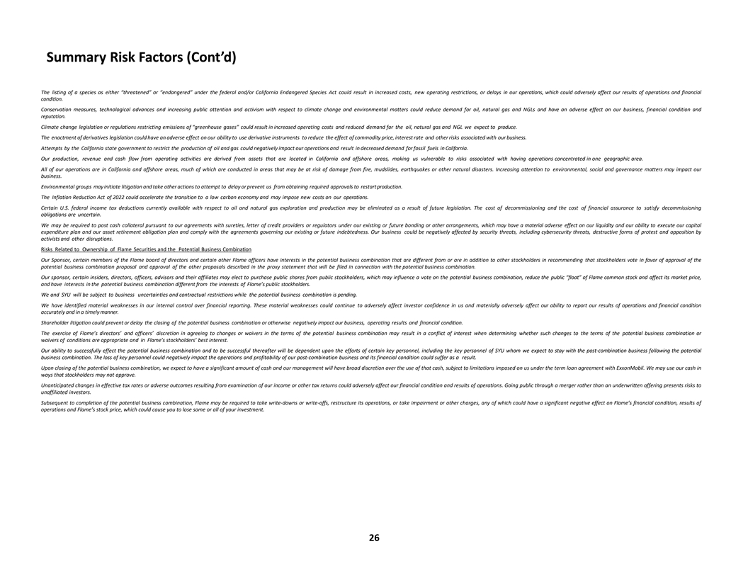 Summary Risk Factors (Cont’d) The listing of a species as either “threatened” or “endangered” under the federal and/or California Endangered Species Act could result in increased costs, new operating restrictions, or delays in our operations, which could adversely affect our results of operations and financial condition. Conservation measures, technological advances and increasing public attention and activism with respect to climate change and environmental matters could reduce demand for oil, natural gas and NGLs and have an adverse effect on our business, financial condition and reputation. Climate change legislation or regulations restricting emissions of “greenhouse gases” could result in increased operating costs and reduced demand for the oil, natural gas and NGL we expect to produce. The enactment of derivatives legislation could have an adverse effect on our ability to use derivative instruments to reduce the effect of commodity price, interest rate and other risks associated with our business. Attempts by the California state government to restrict the production of oil and gas could negatively impact our operations and result in decreased demand for fossil fuels in California. Our production, revenue and cash flow from operating activities are derived from assets that are located in California and offshore areas, making us vulnerable to risks associated with having operations concentrated in one geographic area. All of our operations are in California and offshore areas, much of which are conducted in areas that may be at risk of damage from fire, mudslides, earthquakes or other natural disasters. Increasing attention to environmental, social and governance matters may impact our business. Environmental groups may initiate litigation and take other actions to attempt to delay or prevent us from obtaining required approvals to restart production. The Inflation Reduction Act of 2022 could accelerate the transition to a low carbon economy and may impose new costs on our operations. Certain U.S. federal income tax deductions currently available with respect to oil and natural gas exploration and production may be eliminated as a result of future legislation. The cost of decommissioning and the cost of financial assurance to satisfy decommissioning obligations are uncertain. We may be required to post cash collateral pursuant to our agreements with sureties, letter of credit providers or regulators under our existing or future bonding or other arrangements, which may have a material adverse effect on our liquidity and our ability to execute our capital expenditure plan and our asset retirement obligation plan and comply with the agreements governing our existing or future indebtedness. Our business could be negatively affected by security threats, including cybersecurity threats, destructive forms of protest and opposition by activists and other disruptions. Risks Related to Ownership of Flame Securities and the Potential Business Combination Our Sponsor, certain members of the Flame board of directors and certain other Flame officers have interests in the potential business combination that are different from or are in addition to other stockholders in recommending that stockholders vote in favor of approval of the potential business combination proposal and approval of the other proposals described in the proxy statement that will be filed in connection with the potential business combination. Our sponsor, certain insiders, directors, officers, advisors and their affiliates may elect to purchase public shares from public stockholders, which may influence a vote on the potential business combination, reduce the public “float” of Flame common stock and affect its market price, and have interests in the potential business combination different from the interests of Flame’s public stockholders. We and SYU will be subject to business uncertainties and contractual restrictions while the potential business combination is pending. We have identified material weaknesses in our internal control over financial reporting. These material weaknesses could continue to adversely affect investor confidence in us and materially adversely affect our ability to report our results of operations and financial condition accurately and in a timely manner. Shareholder litigation could prevent or delay the closing of the potential business combination or otherwise negatively impact our business, operating results and financial condition. The exercise of Flame’s directors’ and officers’ discretion in agreeing to changes or waivers in the terms of the potential business combination may result in a conflict of interest when determining whether such changes to the terms of the potential business combination or waivers of conditions are appropriate and in Flame’s stockholders’ best interest. Our ability to successfully effect the potential business combination and to be successful thereafter will be dependent upon the efforts of certain key personnel, including the key personnel of SYU whom we expect to stay with the post-combination business following the potential business combination. The loss of key personnel could negatively impact the operations and profitability of our post-combination business and its financial condition could suffer as a result. Upon closing of the potential business combination, we expect to have a significant amount of cash and our management will have broad discretion over the use of that cash, subject to limitations imposed on us under the term loan agreement with ExxonMobil. We may use our cash in ways that stockholders may not approve. Unanticipated changes in effective tax rates or adverse outcomes resulting from examination of our income or other tax returns could adversely affect our financial condition and results of operations. Going public through a merger rather than an underwritten offering presents risks to unaffiliated investors. Subsequen
