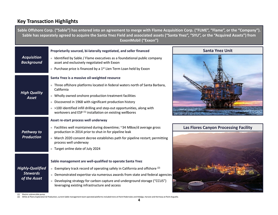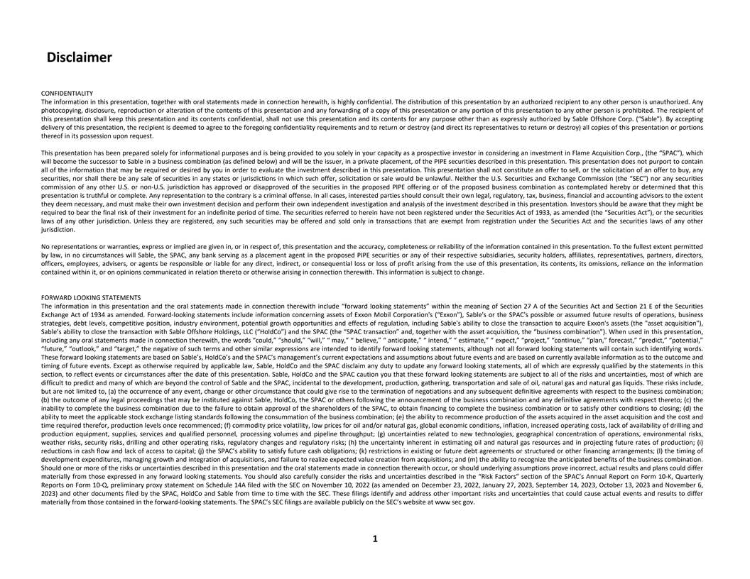 Disclaimer CONFIDENTIALITY The information in this presentation, together with oral statements made in connection herewith, is highly confidential. The distribution of this presentation by an authorized recipient to any other person is unauthorized. Any photocopying, disclosure, reproduction or alteration of the contents of this presentation and any forwarding of a copy of this presentation or any portion of this presentation to any other person is prohibited. The recipient of this presentation shall keep this presentation and its contents confidential, shall not use this presentation and its contents for any purpose other than as expressly authorized by Sable Offshore Corp. (“Sable”). By accepting delivery of this presentation, the recipient is deemed to agree to the foregoing confidentiality requirements and to return or destroy (and direct its representatives to return or destroy) all copies of this presentation or portions thereof in its possession upon request. This presentation has been prepared solely for informational purposes and is being provided to you solely in your capacity as a prospective investor in considering an investment in Flame Acquisition Corp., (the “SPAC”), which will become the successor to Sable in a business combination (as defined below) and will be the issuer, in a private placement, of the PIPE securities described in this presentation. This presentation does not purport to contain all of the information that may be required or desired by you in order to evaluate the investment described in this presentation. This presentation shall not constitute an offer to sell, or the solicitation of an offer to buy, any securities, nor shall there be any sale of securities in any states or jurisdictions in which such offer, solicitation or sale would be unlawful. Neither the U.S. Securities and Exchange Commission (the “SEC”) nor any securities commission of any other U.S. or non-U.S. jurisdiction has approved or disapproved of the securities in the proposed PIPE offering or of the proposed business combination as contemplated hereby or determined that this presentation is truthful or complete. Any representation to the contrary is a criminal offense. In all cases, interested parties should consult their own legal, regulatory, tax, business, financial and accounting advisors to the extent they deem necessary, and must make their own investment decision and perform their own independent investigation and analysis of the investment described in this presentation. Investors should be aware that they might be required to bear the final risk of their investment for an indefinite period of time. The securities referred to herein have not been registered under the Securities Act of 1933, as amended (the “Securities Act”), or the securities laws of any other jurisdiction. Unless they are registered, any such securities may be offered and sold only in transactions that are exempt from registration under the Securities Act and the securities laws of any other jurisdiction. No representations or warranties, express or implied are given in, or in respect of, this presentation and the accuracy, completeness or reliability of the information contained in this presentation. To the fullest extent permitted by law, in no circumstances will Sable, the SPAC, any bank serving as a placement agent in the proposed PIPE securities or any of their respective subsidiaries, security holders, affiliates, representatives, partners, directors, officers, employees, advisers, or agents be responsible or liable for any direct, indirect, or consequential loss or loss of profit arising from the use of this presentation, its contents, its omissions, reliance on the information contained within it, or on opinions communicated in relation thereto or otherwise arising in connection therewith. This information is subject to change. FORWARD LOOKING STATEMENTS The information in this presentation and the oral statements made in connection therewith include “forward looking statements” within the meaning of Section 27 A of the Securities Act and Section 21 E of the Securities Exchange Act of 1934 as amended. Forward-looking statements include information concerning assets of Exxon Mobil Corporation's (“Exxon”), Sable's or the SPAC's possible or assumed future results of operations, business strategies, debt levels, competitive position, industry environment, potential growth opportunities and effects of regulation, including Sable's ability to close the transaction to acquire Exxon's assets (the asset acquisition ), Sable’s ability to close the transaction with Sable Offshore Holdings, LLC (“HoldCo”) and the SPAC (the “SPAC transaction” and, together with the asset acquisition, the “business combination”). When used in this presentation, including any oral statements made in connection therewith, the words “could,” “should,” “will,” “ may,” “ believe,” “ anticipate,” “ intend,” “ estimate,” “ expect,” “project,” “continue,” “plan,” forecast,” “predict,” “potential,” “future,” “outlook,” and “target,” the negative of such terms and other similar expressions are intended to identify forward looking statements, although not all forward looking statements will contain such identifying words. These forward looking statements are based on Sable’s, HoldCo’s and the SPAC’s management’s current expectations and assumptions about future events and are based on currently available information as to the outcome and timing of future events. Except as otherwise required by applicable law, Sable, HoldCo and the SPAC disclaim any duty to update any forward looking statements, all of which are expressly qualified by the statements in this section, to reflect events or circumstances after the date of this presentation. Sable, HoldCo and the SPAC caution you that these forward looking statements are subject to all 