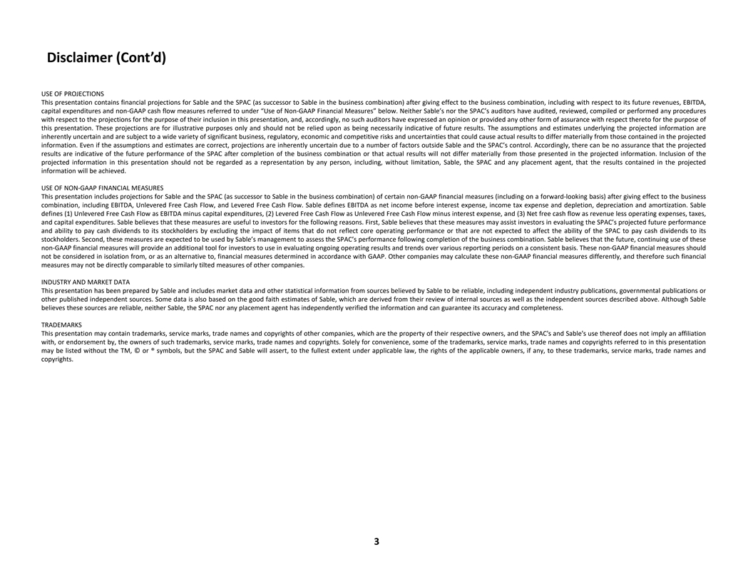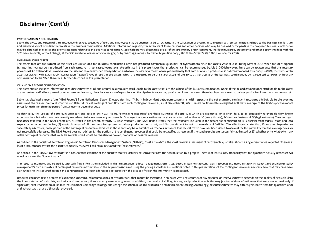 Disclaimer (Cont’d) PARTICIPANTS IN A SOLICITATION Sable, the SPAC, and certain of their respective directors, executive officers and employees may be deemed to be participants in the solicitation of proxies in connection with certain matters related to the business combination and may have direct or indirect interests in the business combination. Additional information regarding the interests of those persons and other persons who may be deemed participants in the proposed business combination may be obtained by reading the proxy statement relating to the business combination. Stockholders may obtain free copies of the preliminary proxy statement, the definitive proxy statement and other documents filed with the SEC, once available, without charge, at the SEC’s website located at www.sec.gov, or by directing a request to Flame Acquisition Corp., 700 Milam Street Suite 3300, Houston, TX 77002. NON-PRODUCING ASSETS The assets that are the subject of the asset acquisition and the business combination have not produced commercial quantities of hydrocarbons since the assets were shut-in during May of 2015 when the only pipeline transporting hydrocarbons produced from such assets to market ceased operations. We estimate in this presentation that production can be recommenced by July 1, 2024; however, there can be no assurance that the necessary permits will be obtained that would allow the pipeline to recommence transportation and allow the assets to recommence production by that date or at all. If production is not recommenced by January 1, 2026, the terms of the asset acquisition with Exxon Mobil Corporation (“Exxon”) would result in the assets, which are expected to be the major assets of the SPAC at the closing of the business combination, being reverted to Exxon without any compensation to the SPAC therefor as further described in this presentation. OIL AND GAS RESOURCE INFORMATION This presentation includes information regarding estimates of oil and natural gas resources attributable to the assets that are the subject of the business combination. None of the oil and gas resources attributable to the assets are currently classifiable as proved or other reserves because, since the cessation of operations on the pipeline transporting production from the assets, there has been no means to deliver production from the assets to market. Sable has obtained a report (the “NSAI Report”) from Netherland, Sewell & Associates, Inc. (“NSAI”), independent petroleum consultants, with respect to the net estimated contingent resources attributable to the acquired assets and the related pre-tax discounted (at 10%) future net contingent cash flow from such contingent resources, as of December 31, 2021, based on 12-month unweighted arithmetic average of the first-day-of-the-month prices for each month in the period from January to December 2021. As defined by the Society of Petroleum Engineers and used in the NSAI Report, “contingent resources” are those quantities of petroleum which are estimated, on a given date, to be potentially recoverable from known accumulations, but which are not currently considered to be commercially recoverable. Contingent resource estimates may be characterized further as 1C (low estimate), 2C (best estimate) and 3C (high estimate). The contingent resources reflected in the NSAI Report are, as stated in the report, category 1C (low estimate). The NSAI Report states that the estimates included in the report are contingent on (1) approval from federal, state and local regulators to restart production, (2) reestablishment of oil transportation systems to deliver production to market, and (3) commitment to restart the wells and facilities. The NSAI Report states that, if these contingencies are successfully addressed, some portion of the contingent resources estimated in the report may be reclassified as reserves but notes that the estimates have not been risked to account for the possibility that the contingencies are not successfully addressed. The NSAI Report does not address (1) the portion of the contingent resources that could be reclassified as reserves if the contingencies are successfully addressed or (2) whether or to what extentany of the contingent resources that could be so reclassified would be classified as proved, probable or possible reserves. As defined in the Society of Petroleum Engineers’ Petroleum Resources Management System (“PRMS”), best estimate is the most realistic assessment of recoverable quantities if only a single result were reported. There is at least a 50% probability that the quantities actually recovered will equal or exceed the “best estimate.” As defined in the PRMS, low estimate is a conservative estimate of the quantity that will actually be recovered from the accumulation by a project. There is at least a 90% probability that the quantities actually recovered will equal or exceed the “low estimate.” The resource estimates and related future cash flow information included in this presentation reflect management's estimates, based in part on the contingent resources estimated in the NSAI Report and supplemented by management's own estimates of contingent resources attributable to the acquired assets and using the pricing and other assumptions noted in this presentation, of the contingent resources and cash flow that may have been attributable to the acquired assets if the contingencies had been addressed successfully on the date as of which the information is presented. Resource engineering is a process of estimating underground accumulations of hydrocarbons that cannot be measured in an exact way. The accuracy of any resource or reserve estimate depends on the quality of available data, the interpretation of such data, and price and cost assumptions made by reserve engineers. In addition, the results of drilling, testing, and production activities may justify revisions of estimates that were made previously. I